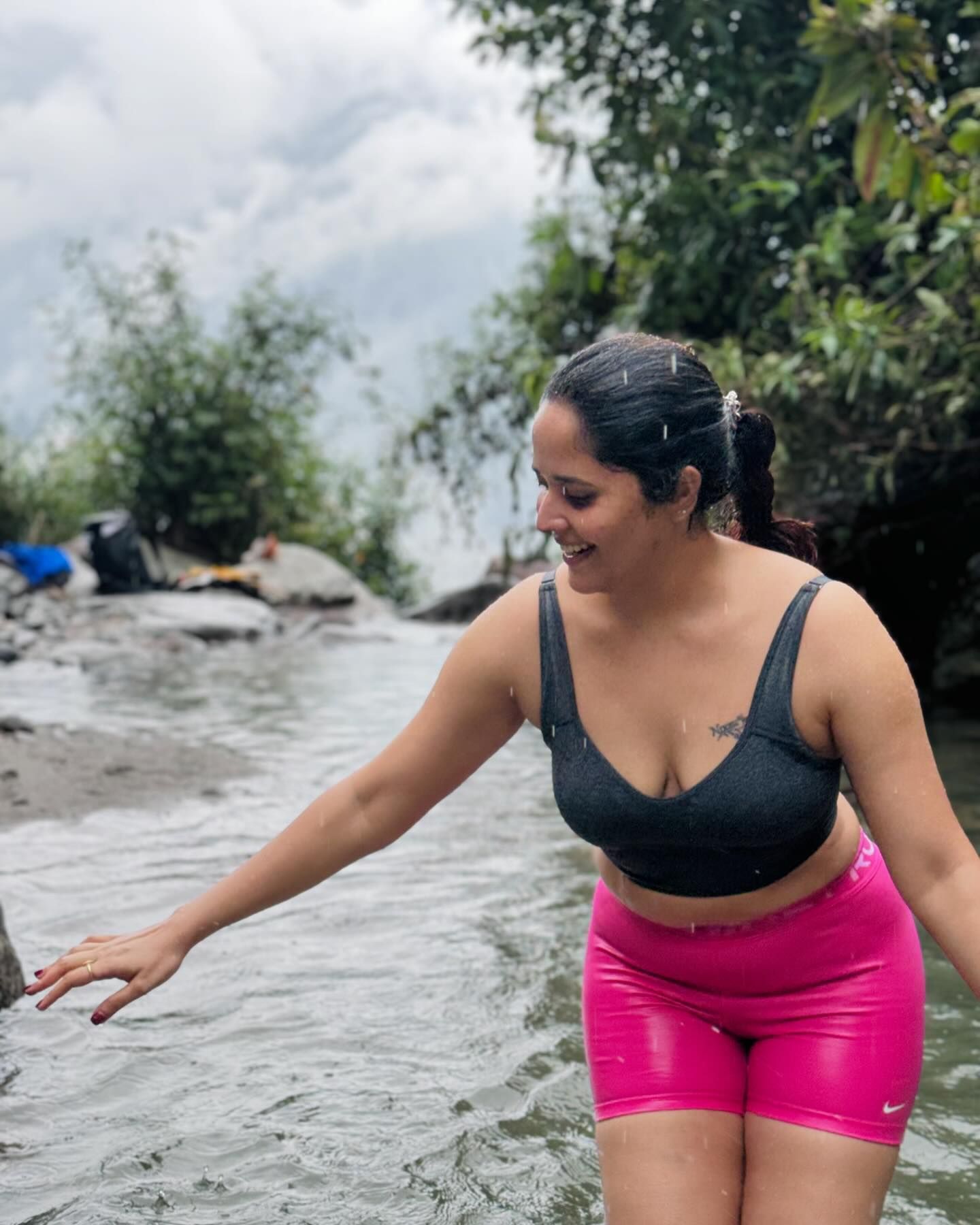 actress Anasuya on her trekking adventures! Explore stunning mountain forests, cascading waterfalls, and hidden streams. Discover breathtaking scenery and new memories in every photo.