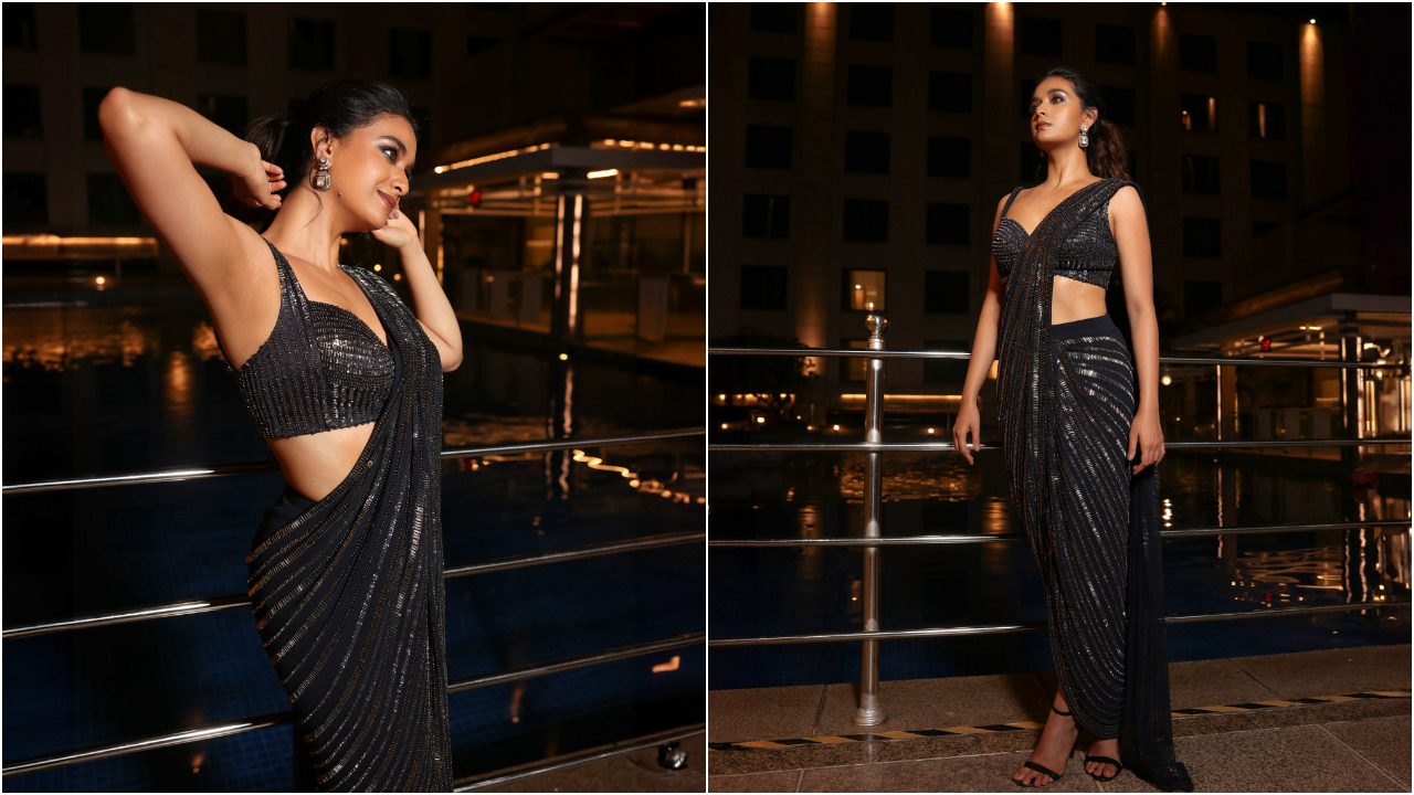 Keerthy Suresh dazzles in a stunning black saree, embodying elegance and grace. The rich fabric beautifully drapes around her, accentuating her silhouette while intricate detailing adds a touch of sophistication.
