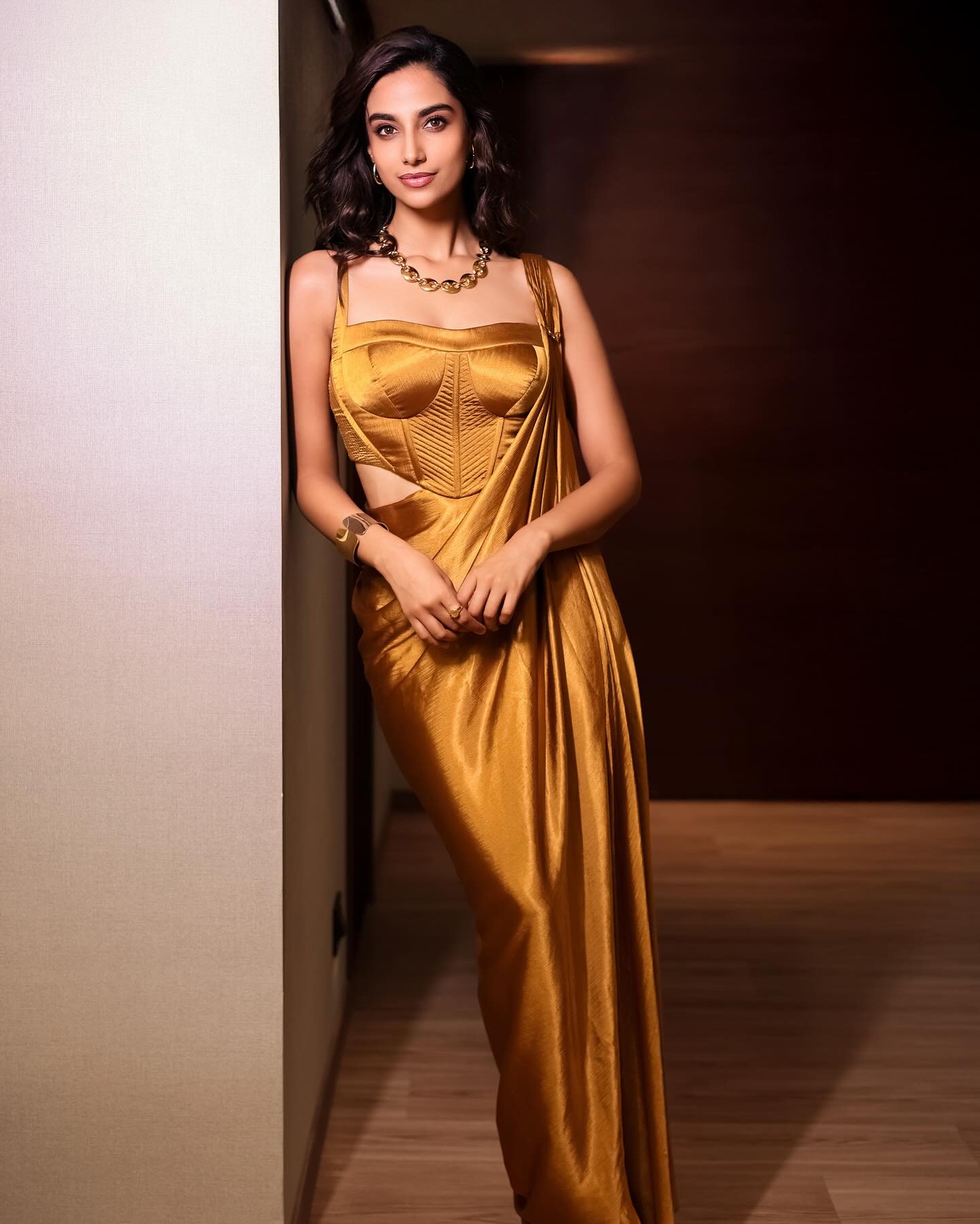 At a glamorous event, Meenakshi dazzled in a golden sequin gown that shimmered under the lights. The gown's sparkling sequins enhanced her radiant beauty, making her the center of attention.