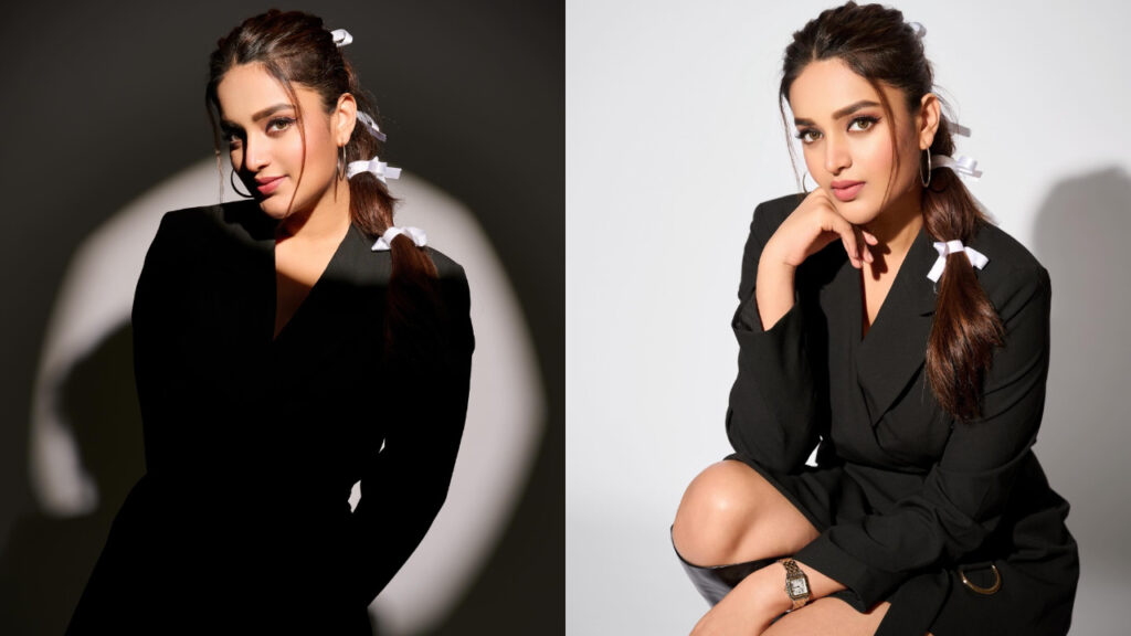 Nidhhi Agerwal exudes elegance in her stunning black suit, showcasing a perfect blend of traditional and contemporary style. The suit features intricate embroidery that highlights her silhouette, while the flowing fabric adds a touch of grace