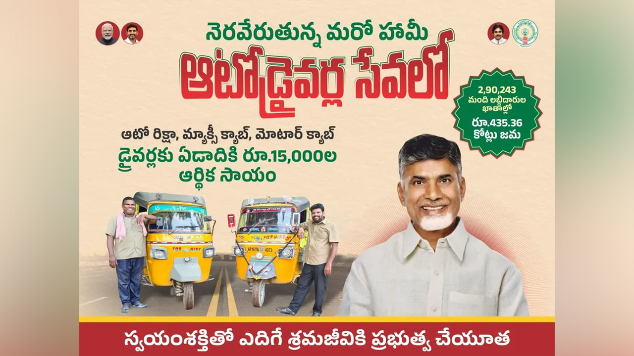 ఏపీలో ఆటో, క్యాబ్ డ్రైవర్ల కుటుంబాలకు రూ.15 వేల ఆర్థిక సాయం అందించే ‘ఆటో డ్రైవర్ సేవలో’ పథకాన్ని సీఎం చంద్రబాబు ప్రారంభించారు.
