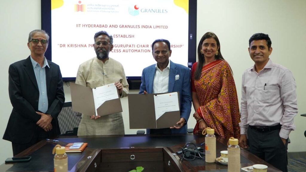 విధాత, హైదరాబాద్: పారిశ్రామిక ఆటోమేషన్లో అత్యాధునిక పరిశోధనలు, ఆవిష్కరణలను ప్రోత్సహించేందుకు ఐఐటీ హైదరాబాద్, గ్రాన్యూల్స్ ఇండియా లిమిటెడ్ జతకట్టాయి. ప్రాసెస్ ఆటోమేషన్లో డా. కృష్ణప్రసాద్ చిగురుపాటి చైర్ ప్రొఫెసర్షిప్ ఏర్పాటు కోసం ఈ రెండు సంస్థలు ఒప్పందం చేసుకున్నాయి. ఈ ఒప్పందంపై ఐఐటీ హైదరాబాద్ డైరెక్టర్ బీఎస్ మూర్తి, గ్రాన్యూల్స్ ఇండియా ఛైర్మన్ డా. కృష్ణప్రసాద్ సంతకాలు చేశారు.