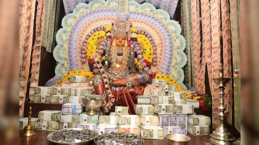 మార్కెట్లో చలామణిలో ఉన్న 10, 20, 50, 100, 200, 500 రూపాయాల నోట్లతో అమ్మవారిని, ఆలయ ప్రాంగణాన్ని అలంకరించారు. మహాలక్ష్మిగా దర్శనమిచ్చిన అమ్మవారిని దర్శించుకునేందుకు భక్తులు భారీగా తరలివచ్చారు.