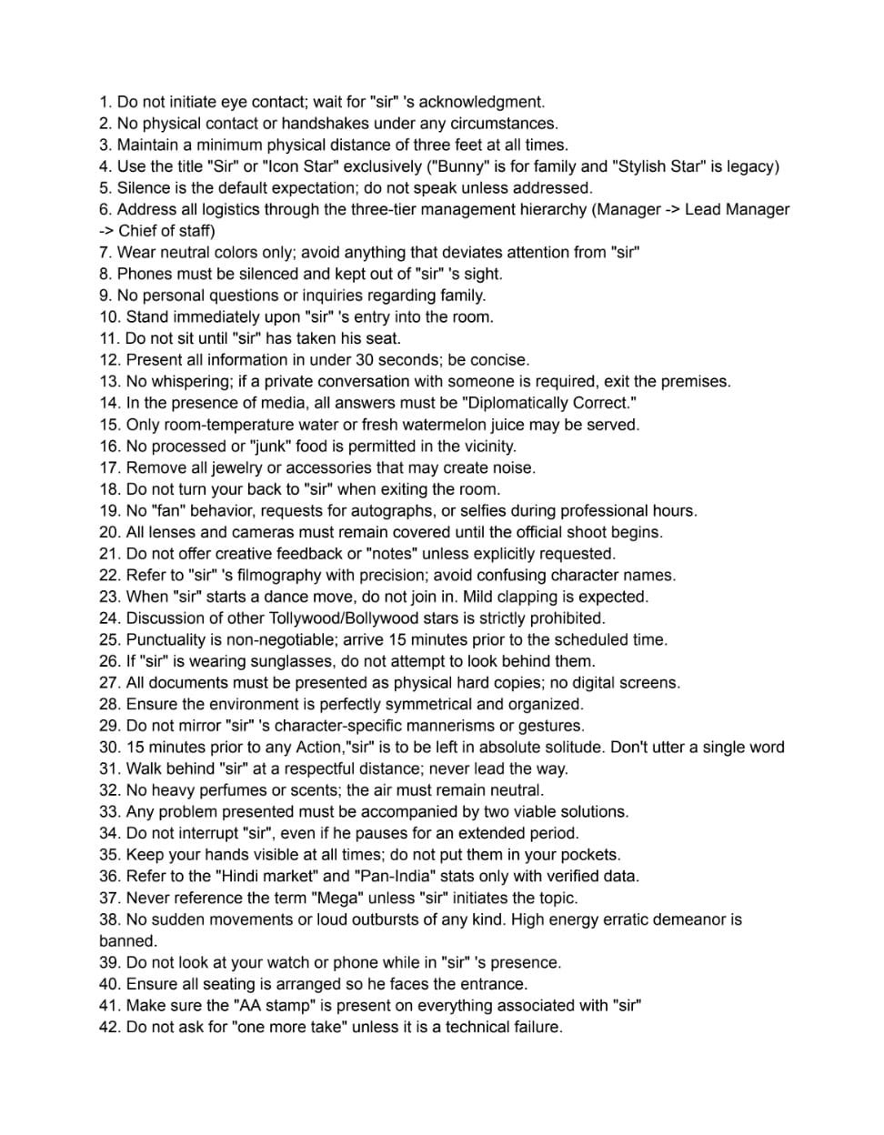 వైరల్ అవుతున్న జాబితాలోని కొన్ని షరతులు మరింత ఆసక్తికరంగా మారాయి. అల్లు అర్జున్తో షేక్ హ్యాండ్ ఇవ్వకూడదు, కనీసం మూడు అడుగుల భౌతిక దూరం పాటించాలి, “స్టైలిష్ స్టార్” కాకుండా “ఐకాన్ స్టార్” అని మాత్రమే సంబోధించాలి, కంటికి ఇబ్బంది కలిగించే దుస్తులు లేదా ఆభరణాలు ధరించకూడదు, ఆయన గదిలోకి రాగానే లేచి నిలబడాలి, వ్యక్తిగత విషయాలు అడగకూడదు, ఫ్యాన్స్లా ప్రవర్తించకూడదు, ఆటోగ్రాఫ్లు లేదా సెల్ఫీలు కోరకూడదు వంటి నిబంధనలు ఉన్నట్లు ప్రచారం జరుగుతోంది. అలాగే ఫోన్ కనిపించేలా పెట్టకూడదని, బయటకు వెళ్లేటప్పుడు వీపు చూపించకూడదనే సూచనలూ ఉన్నట్లు నెటిజన్లు చెబుతున్నారు.