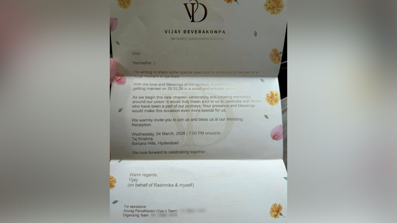 విజయ్ - రష్మిక పెళ్లి ఫిక్స్! ఫిబ్రవరి 26న ఉదయ్పూర్లో వివాహం, మార్చి 4న హైదరాబాద్లో రిసెప్షన్. సోషల్ మీడియాలో వైరల్ అవుతున్న శుభలేఖ. త్వరలోనే అధికారిక ప్రకటన.