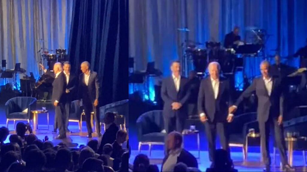 శనివారం లాస్ఏంజెల్స్ (Los Angeles) లో జరిగిన ఫండ్ రైజింగ్ క్యాంపెయిన్లో ఈ ఆసక్తికర ఘటన చోటు చేసుకుంది. పీకాక్ థియేటర్లో అర్ధరాత్రి జిమ్మీ కిమ్మెల్ (Jimmy Kimmel) తో 45 నిమిషాలపాటు సరదాగా ఇంటర్వ్యూ జరిగింది. అనంతరం స్టేజ్పై ఉన్న బైడెన్, ఒబామా అక్కడున్న వారికి అభివాదం చేశారు. ఆ సమయంలో బైడెన్ దాదాపు 10 సెకన్లపాటు నిశ్చలంగా ఉండిపోయారు. బైడెన్లో ఎలాంటి చలనం లేకపోవడాన్ని గమనించిన బరాక్ ఒబామా.. ఆయన చేయి పట్టుకుని అక్కడి నుంచి తీసుకెళ్లిపోయారు. ఈ దృశ్యాలు స్టేజ్పై ఉన్న కెమెరాలకు చిక్కాయి. ప్రస్తుతం ఆ వీడియో వైరల్గా మారింది.