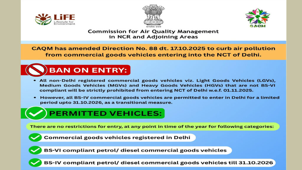 నవంబర్ 1వ తేదీ నుంచి ఢిల్లీ చుట్టూ ఉన్న అన్ని చెక్ పోస్టుల వద్ద బీఎస్-6 కమర్షియల్ వాహనాలు అనగా లారీలు, ట్రక్కులు, రవాణా చేసే వాహనాలను మాత్రమే అనుమతిస్తారు. హర్యానా, ఉత్తరప్రదేశ్, రాజస్థాన్ ప్రభుత్వాలకు ఇప్పటికే లేఖలు రాశారు. ఢిల్లీ ప్రభుత్వ ఆదేశాల ప్రకారం వాహనాలను నియంత్రించే బాధ్యతను కూడా ఆ రాష్ట్రాలకు అప్పగించారు. బీఎస్-6 వాహనాల్లో భారత్ స్టేజ్-4 అత్యున్నత వాయు ప్రమాణాలతో అభివృద్ధి చేశారు. మానవులకు హాని కలిగించే నైట్రోజన్ ఆక్సైడ్, సూక్ష్మ ధూళి కణాలను స్వల్ప మోతాదులో విడుదల చేస్తాయి. ప్రమాణాలకు మించి పొగ వెద జల్లడం మూలంగా శ్యాసకోస వ్యాధుల బారిన పడుతున్నారు. బీఎస్-4 వాహనాలతో పోల్చితే బీఎస్-6 వాహనాల్లో సల్ఫర్ మోతాదు తక్కువగా ఉంటుంది. దేశంలో 2020 ఏప్రిల్ 1వ తేదీ నుంచి బీఎస్-6 ప్రమాణాలు ఉన్న వాహనాలను విక్రయిస్తున్నారు. అయితే ఢిల్లీ రిజిస్ట్రేషన్ నెంబర్ తో ఉన్న బీఎస్-4 డీజిల్ వాహనాలను వచ్చే ఏడాది అక్టోబర్ 31వ తేదీ వరకు అనుమతించనున్నారు.
