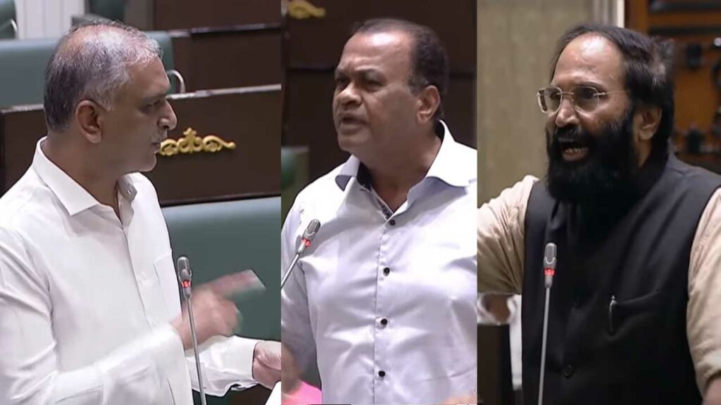 వెంకట్ రెడ్డి వ్యాఖ్యలపై హరీష్ రావు స్పందిస్తూ నన్ను మాట మారుస్తున్నారని..నేరుగా సబ్జెక్టు చర్చించాలని సూచిస్తున్నారని..ఆయన గతంలో కాళేశ్వరం ప్రపంచంలోనే గొప్ప ప్రాజెక్టు అంటూ మాట్లాడిన వీడియో చూపించాలా అంటూ ప్రశ్నించారు. దీంతో రెచ్చిపోయిన వెంకట్ రెడ్డి మీరు గతంలో ఇదే సభలో తెలంగాణ ఇచ్చిన దేవత సోనియాగాంధీ, కాంగ్రెస్ పార్టీతోనే తెలంగాణ వచ్చిందని చెప్పిన వీడియో కూడా ఉందంటూ కౌంటర్ వేశారు. దీంతో కాంగ్రెస్, బీఆర్ఎస్ సభ్యుల మధ్య మాటల యుద్దం తారాస్థాయికి చేరి సభలో గందరగోళం నెలకొంది. అసలు బీసీ రిజర్వేషన్, కాళేశ్వరం నివేదికపై చర్చ జరుగుతుంటే కేసీఆర్ సభకు ఎందుకు రాలేదన్నారు. కాళేశ్వరం ప్రాజెక్టుతో తప్పు చేశామని ప్రజలను కేసీఆర్ క్షమాపణ కోరాలని డిమాండ్ చేశారు. మళ్లీ హరీష్ రావు మాట్లాడుతూ అసెంబ్లీలో మంత్రి ఉత్తమ్ పవర్ పాయింట్ ప్రజెంటేషన్ ఇచ్చేదుండేనని గతంలో వెంకట్ రెడ్డి అన్నారని వ్యాఖ్యానించగా..ఉత్తమ్ లేచి ఆగ్రహంతో ..సిగ్గుండాలి లక్షకోట్లు వృధా చేసి మీదకెళ్లి అబద్దాలు మాట్లాడుతున్నారంటూ హరీష్ రావుపై మండిపడ్డారు.