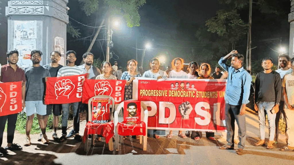 ఈ సందర్భంగా బి.నరసింహారావు మాట్లాడుతూ కేంద్రంలో నరేంద్ర మోదీ, రాష్ట్రంలో రేవంత్ రెడ్డి ప్రభుత్వాలు అనుసరిస్తున్న విద్యార్థి వ్యతిరేక విధానాలను విద్యార్థి లోకం ఐక్యంగా తిప్పికొట్టాలని అన్నారు. దేశంలో పేద వర్గాల విద్యార్థులకు ఉచితంగా నాణ్యమైన విద్యను అందించడంలో ప్రభుత్వాలు విఫలమయ్యాయని తెలిపారు. మోదీ ప్రభుత్వం అనుసరిస్తున్న విద్యా కాషాయకరణను విద్యార్థులంతా ప్రతిఘటించాలని కోరారు. ఈ కార్యక్రమంలో పీడీఎస్యూ కాకతీయ యూనివర్సిటీ ప్రధాన కార్యదర్శి వి.కావ్య, ఉపాధ్యక్షులు పి. అనూష, శ్రీజ, లోకేష్, సహాయ కార్యదర్శులు సాధన, చందన, శ్రీకాంత్, నాయకులు గణేష్, బాలు, చారి, రమేష్ తదితరులు పాల్గొన్నారు.