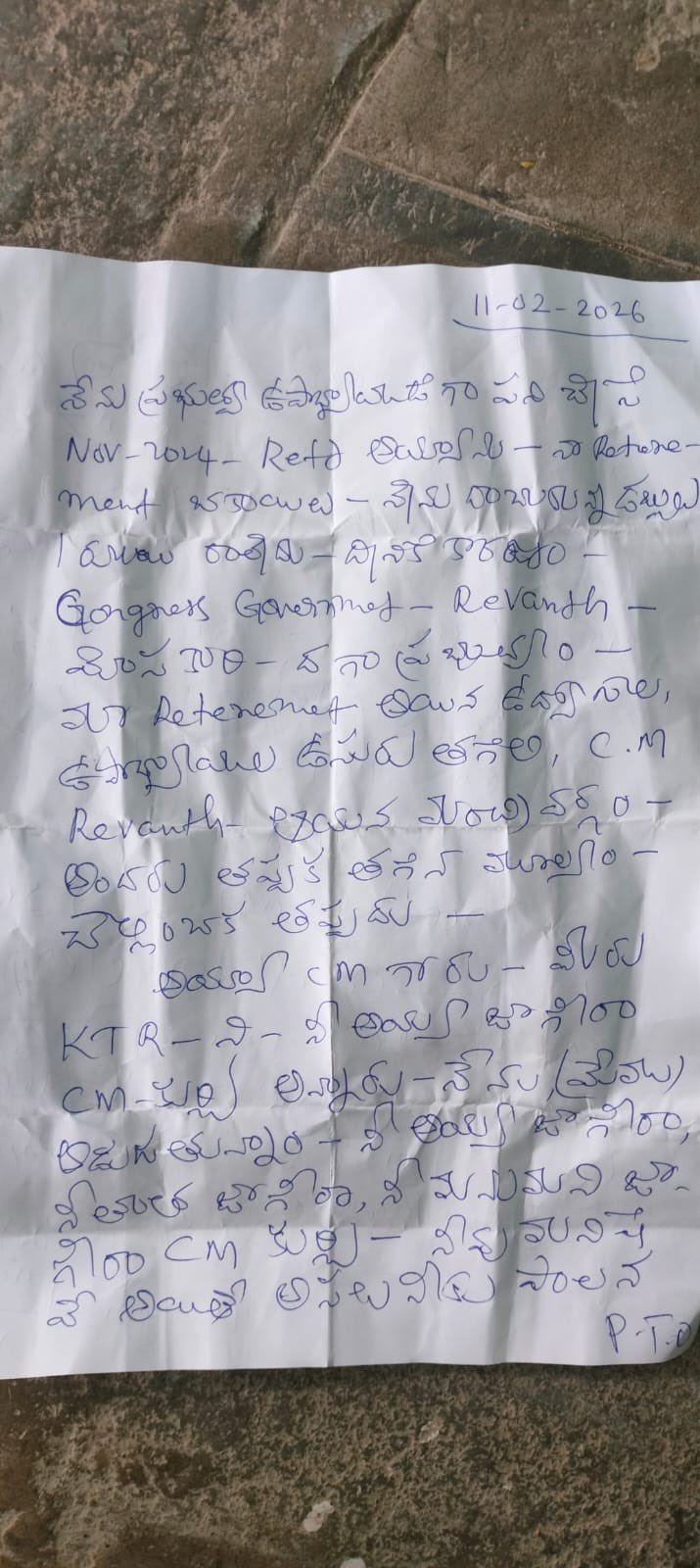 మంచిర్యాల జిల్లా లక్సెట్టిపేట మున్సిపాలిటీలోని 14వ వార్డు బ్యాలెట్ బాక్సులో, తమకు రిటైర్మెంట్ బెనిఫిట్స్ ఇవ్వాలనిరి టైర్డ్ ఉద్యోగి సీఎం రేవంత్ రెడ్డికి రాసిన లేఖ కౌంటింగ్ సందర్భంగా వెలుగు చూసింది. మా రిటైర్డ్ ఉద్యోగుల ఉసురు తగిలి రేవంత్ రెడ్డి ఆయన మంత్రులు తగిన మూల్యం చెల్లిస్తారు అని బాధిత పెన్షనర్ హెచ్చరించాడు. కేటీఆర్ను సీఎం కుర్చీ నీ అయ్య జాగీరా అంటున్నావు, మరి సీఎం కుర్చీ నీ జాగీరా, నీ మామ జాగీరా అని మేము అడుగుతున్నామంటూ లేఖ లో ప్రశ్నించాడు.