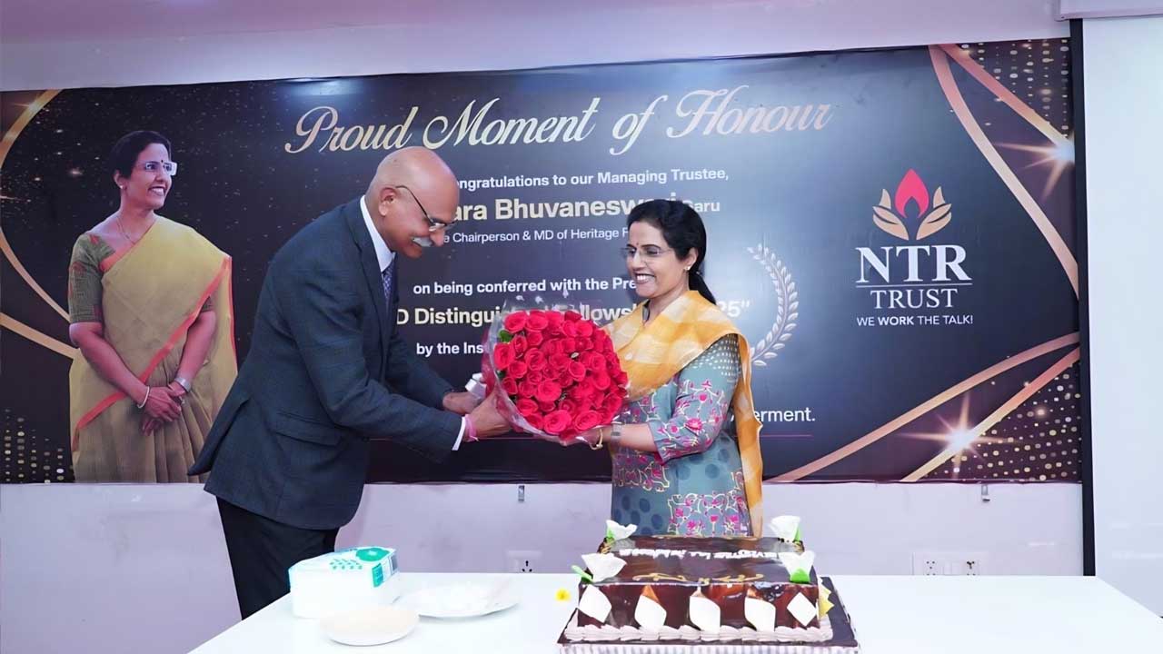ఏసీ సీఎం చంద్రబాబు సతీమణి నారా భువనేశ్వరి ప్రతిష్టాత్మక డిస్టింగ్విష్డ్ ఫెలోషిప్ అవార్డు-2025కి ఎంపికైంది. ప్రజాసేవ, సామాజిక అంశాల్లో కీలకంగా పని చేసినందుకు ఈ ప్రతిష్టాత్మక అవార్డు అందిస్తున్నట్టు ఐఓడీ ఇనిస్టిట్యూట్ ఆఫ్ డైరెక్టర్స్(ఐవోడీ) సంస్థ ప్రకటించింది.