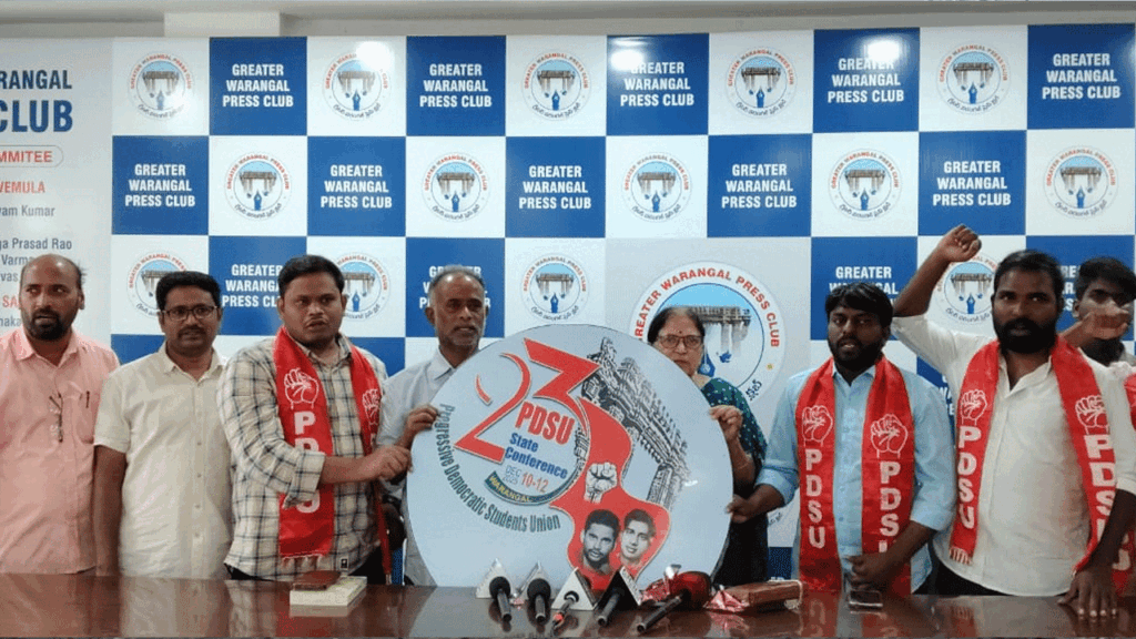 తెలంగాణలో రేవంత్ రెడ్డి సర్కార్ అధికారంలోకి వచ్చి రెండు సంవత్సరాలు గడుస్తున్నా విద్యార్థుల సమస్యలను పరిష్కరించడంలో విఫలమైందన్నారు. కనీసం పెండింగ్ లో ఉన్న ఫీజు రీయింబర్స్మెంట్, స్కాలర్షిప్ కూడా విద్యార్థులకు ఇవ్వకుండా మొండిగా వ్యవహరిస్తుందన్నారు. విద్యార్థులు సమస్యల పరిష్కారం కోసం సమరశీల ఐక్య ఉద్యమాలు చేయాలన్నారు. డిసెంబర్ 10న ఆర్ట్స్ కాలేజ్ ఆడిటోరియం ముందు బహిరంగ సభ,11 ,12 తేదీల్లో అబ్నుస్ ఫంక్షన్ హాల్లో జరిగే ప్రతినిధుల సభలను జయప్రదం చేయాలని పిలుపునిచ్చారు. ఈ కార్యక్రమంలో పీడీఎస్యూ జాతీయ నాయకులు పి.మహేష్, రాష్ట్ర ప్రధాన కార్యదర్శి పొడపంగి నాగరాజు, రాష్ట్ర ఉపాధ్యక్షులు బోనగిరి మధు, డాక్టర్ రాజేష్, వరంగల్ జిల్లా అధ్యక్షుడు గుర్రం అజయ్, ప్రధాన కార్యదర్శి మర్రి మహేష్, సీపీఐ(ఎంఎల్) న్యూ డెమోక్రసీ ఉమ్మడి వరంగల్ జిల్లా కార్యదర్శి ఎలకంటి రాజేందర్, పీడీఎస్యూ మాజీ నాయకులు బాలరాజు, బండి కోటేశ్వర్, అనిల్ రాజేష్, ప్రకాష్, అనిల్ తదితరులు పాల్గొన్నారు.