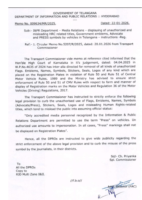 విధాత, హైదరాబాద్: తెలంగాణ ప్రభుత్వం జర్నలిస్టుల అక్రిడిటేషన్ జీవో 252 లో సవరణలు చేస్తూ జీవో ఆర్టీ.నంబర్ 103 ద్వారా ఉత్తర్వులు జారీ చేసింది. అలాగే అక్రిడిటేషన్లు ఉన్న జర్నలిస్టులు మాత్రమే వాహనాలపై PRESS ఉపయోగించాలని తెలంగాణ సమాచార పౌర సంబంధాల శాఖ కమిషనర్ మెమో జారీ చేయడం గమనార్హం