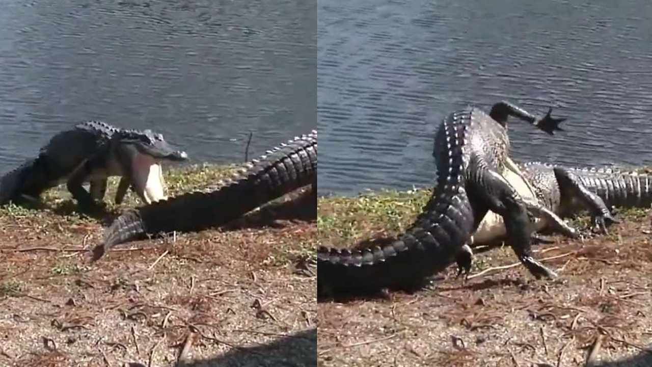 ఒక సరస్సు ఒడ్డున విశ్రాంతి తీసుకుంటున్న రెండు మొసళ్లు ఘర్షణకు దిగాయి. పెద్ద మొసలి తోకను చిన్న మొసలి కొరకగా, పెద్ద మొసలి చిన్న మొసలిపై దాడి చేసింది.