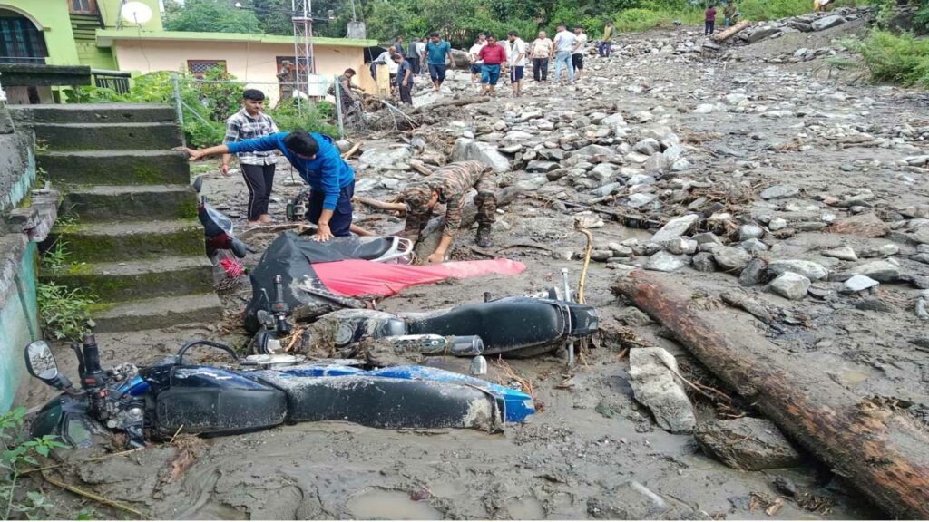 #WATCH | Uttarakhand: Due to a cloudburst in Tharali of Chamoli district, debris has entered houses, the market, and the SDM’s residence. District Magistrate and relief teams have left for the spot. Two people are reported missing: Uttarakhand Disaster Management Secretary Vinod… pic.twitter.com/V2aesFekFf