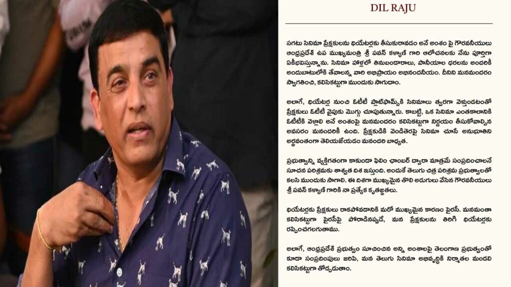 Dil Raju: : సగటు సినిమా ప్రేక్షకులను థియేటర్లకు తీసుకురావడం అనే అంశంపై ఆంధ్రప్రదేశ్ ఉప ముఖ్యమంత్రి పవన్ కళ్యాణ్ ఆలోచనలతో నేను పూర్తిగా ఏకీభవిస్తున్నానని నిర్మాత, టీజీఎఫ్ డీసీ చైర్మన్ దిల్ రాజు స్పష్టం చేశారు. ఈ మేరకు ఓ పత్రిక ప్రకటన విడుదల చేశారు. సినిమా హాళ్లలో తినుబండారాలు, పానీయాల ధరలను అందరికీ అందుబాటులోకి తేవాలన్న వారి అభిప్రాయం అభినందనీయమన్నారు. దీనిని మనమందరం స్వాగతించి, కలిసికట్టుగా ముందుకు సాగుదామన్నారు. థియేటర్ల నుంచి ఓటీటీ ప్లాట్ ఫామ్స్ కు సినిమాలు త్వరగా వెళ్తుండటంతో ప్రేక్షకులు ఓటీటీ వైపుకు మొగ్గు చూపుతున్నారని దిల్ రాజు గుర్తు చేశారు. ఒక సినిమా ఎంతకాలానికి ఓటీటీకి వెళ్లాలి అనే అంశంపై మనమందరం కలిసికట్టుగా నిర్ణయం తీసుకోవాల్సిన అవసరం మనందరికీ ఉందన్నారు.