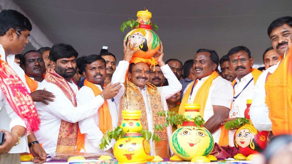విధాత, హైదరాబాద్ : తెలంగాణ రాష్ట్ర పండుగ బోనాల పండుగ వేడుకలు గురువారం గోల్కొండ కోటలో ఘనంగా ప్రారంభమయ్యాయి. ఆషాఢ మాసంలో నెల రోజుల పాటు జరిగే ఈ ఉత్సవాల్లో భాగంగా తొలి బోనం జగదాంబిక అమ్మవారికి సమర్పించారు. లంగర్ హౌస్ నుండి తోట్టేల ఊరేగింపు తో గోల్కొండ బోనాలు మొదలయ్యాయి. తెలంగాణ ప్రభుత్వం తరుపున గోల్కొండ అమ్మవారికి అసెంబ్లీ స్పీకర్ గడ్డం ప్రసాద్ కుమార్, మంత్రులు కొండా సురేఖ, పొన్నం ప్రభాకర్ లు బోనం, పట్టువస్త్రాలు సమర్పించారు. బోనాల పండుగ వేడుకల తొలి రోజున బీజేపీ ఎంపీ ఈటల రాజేందర్, తెలంగాణ జాగృతి అధ్యక్షురాలు, బీఆర్ఎస్ ఎమ్మెల్సీ కవిత హాజరై బోనమెత్తారు. కుమ్మరి సంఘం ఆధ్వర్యంలోని తొలి బోనం శోభాయాత్రలో పాల్గొన్నారు. అనంతరం బంజారా లాల్ దర్వాజ వద్ద కాసాల రోహిత్ పటేల్ నివాసంలో తొలి నజర్ బోనం ఉత్సవంలో కవిత హాజరయ్యారు.