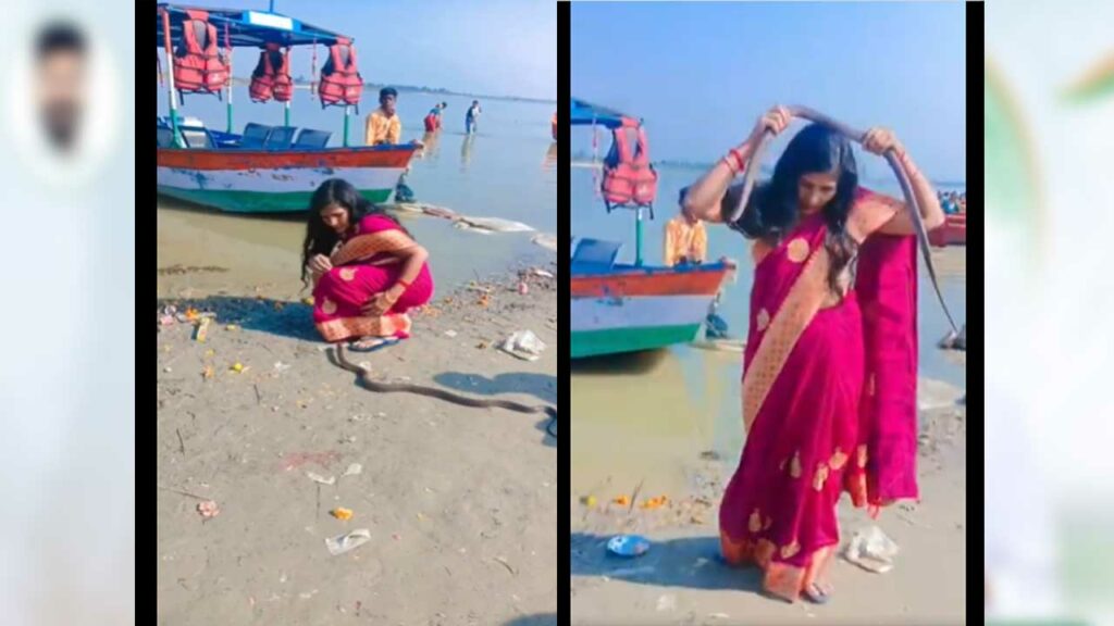 Snake Approaches Woman: నది ఒడ్డున గంగా మాతకు పూజలు చేస్తున్న మహిళ తన వద్ధకు వచ్చిన పామును మెడలో వేసుకుని నాగాభరణంగా మార్చుకున్న ఘటన వైరల్ గా మారింది. నది తీరంలో ఓ మహిళ గంగా పూజలు చేస్తున్న క్రమంలో ఆమె చెంతకు ఓ పాము వచ్చింది. పూజ నుంచి వెనుతిరిగే సమయంలో పక్కన ఉన్న పామును గమనించిన ఆ మహిళ తొలుత కొంత ఆశ్చర్యపోయింది. ఆ వెంటనే భక్తి పారవశ్యంతో ఆ పామును మొక్కిన ఆ మహిళ..ఎలాంటి జంకు లేకుండా దానిని చేతుల్లోకి తీసుకుని ఏకంగా మెడలో నాగాభరణంగా ధరించింది.