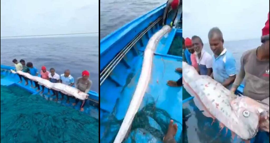 Doomsday Fish: సముద్రంలో జీవించే రకరకాల జీవరాశులలో అరుదైన జలచరాలు ఎన్నో ఉన్నాయి. అవి తీరానికి సమీపంగా వచ్చినప్పుడు లేక జాలర్ల వలలకు చిక్కినప్పుడు వాటిని వింతగా కొత్తగా చూడటం జరుగుతుంది. తాజాగా సముద్రంలో చేపల వేటకు వెళ్లిన తమిళనాడు జాలర్లకు ఓ అరుదైన జాతి వింత చేప వలలో చిక్కింది. జాలర్లకు చిక్కిన దాదాపు 20అడుగుల పొడవు ఉన్న ఈ వింత చేప వీడియో వైరల్ గా మారింది. అది డూమ్స్ డే ఫిష్ జాతి చేపగా గుర్తించారు. పొడవైన శరీరంతో మెరిసే పొలుసులు కలిగిన డూమ్స్ డే ఫిష్ లోతైన సముద్ర జీవి. ఈ చేపలు నవంబర్ లో కాలిఫోర్నియా బీచ్ లో, ఫిబ్రవరిలో మెక్సికలో ఫసిఫిక్ తీరంలో, ఇటీవల ఆస్ట్రేలియా తీరంలోకి కొట్టుకుని వచ్చాయి. సముద్రంలో 200మీటర్ల దిగువన నివసించే డూమ్స్ డే చేపలు అరుదుగా తీరానికి కొట్టుకొస్తుంటాయి.