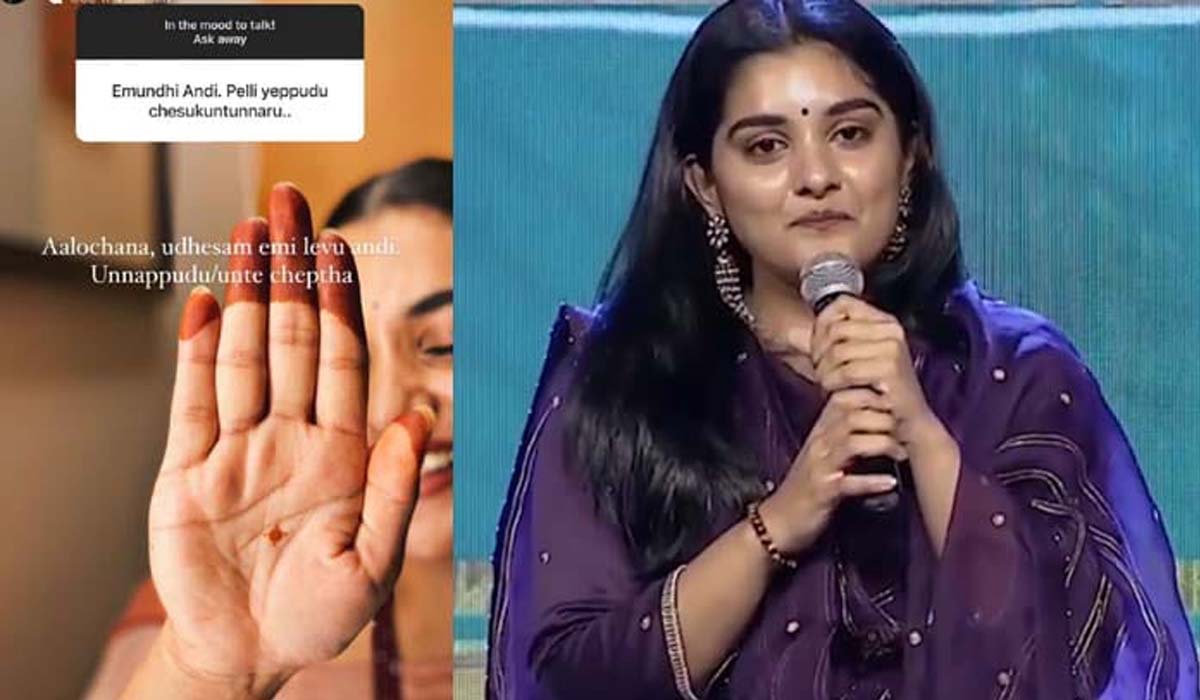చేతికి గోరింటాకు పెట్టుకున్న ఫొటోను షేర్ చేయడంతో పెళ్లి చేసుకోబోతుందని అందరూ ఊహించారు. ఈ క్రమంలో ఓ నెటిజన్ పెళ్లి ఎప్పుడు అని ప్రశ్నించాడు. దానికి సంబంధించిన నివేదా థామస్ స్పందించింది. ప్రస్తుతానికి పెళ్లి ఆలోచన లేదని చెప్పింది.