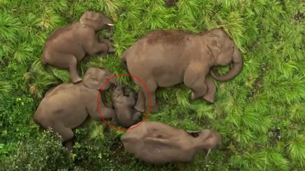 A beautiful elephant family sleeps blissfully somwhere in deep jungles of the Anamalai Tiger Reserve in Tamil Nadu. Observe how the baby elephant is given Z class security by the family. Also how the young elephant is checking the presence of other family members for reassurance.… pic.twitter.com/sVsc8k5I3r
