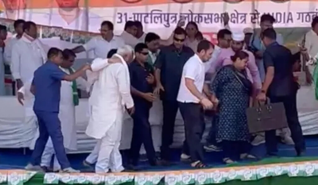 వెంటనే మీసా భారతి ఆయన చేతిని పట్టుకుని పడిపోకుండా చూశారు. ఈ ఘటన కలవరం కలిగించినప్పటికీ.. రాహుల్, మీసా భారతి పరస్పరం చిరునవ్వులు చిందించుకున్నారు. వెంటనే వారి సహాయం కోసం భద్రతా సిబ్బంది వేదికపైకి చేరుకుని సహకారం అందించారు. రాహుల్గాంధీకి ఏమీ కాలేదని వారు సభికులను తెలియజేయడంతో అంతా ఊపిరి పీల్చుకున్నారు. అనంతరం కొనసాగిన ఎన్నికల ప్రచారంలో మాట్లాడిన రాహుల్గాంధీ.. భారతికి తన మద్దతు ప్రకటించారు.