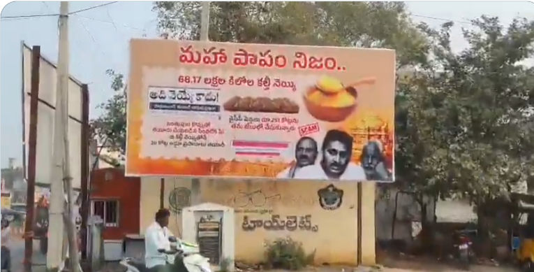 తిరుమల లడ్డూ కల్తీ వివాదాన్ని ప్రచార అస్త్రంగా మలుచుకుకున్న టీడీపీ కూటమి నేను తిరుమల లడ్డూను అంటూ ఓ వీడియోతో సోషల్ మీడియా వేదికగా వైసీపీ పాలకులపై విమర్శల దాడి ఆరంభించింది. ఇంకోవైపు మహాపాపం పేరుతో ఫ్లెక్సీల ఏర్పాటుతో సైతం వైసీపీపై దాడి సాగిస్తుంది. తిరుమలలో 68.17 లక్షల కల్తీ నెయ్యితో 20 కోట్ల లడ్డు తయారీ అంటూ పిడుగురాళ్ల సహా ఏపీలోని పలు ప్రాంతాల్లో వెలిసిన ఫ్లెక్సీలు చర్చనీయాంశమయ్యాయి.