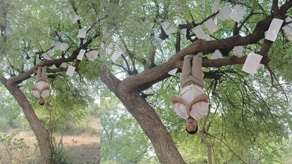 విధాత: తన భూమిని పట్టా భూమిగా మార్చాలంటూ ఓ యువకుడి చేపట్టిన వినూత్న నిరసన సోషల్ మీడియాలో వైరల్ గా మారింది. చెట్టుకు. రంగారెడ్డి జిల్లా ఇబ్రహీంపట్నం మండలంలోని మంగళపల్లి గ్రామం వుల్లింతల జీవన్ తన భూమిని పట్టా భూమిగా మార్చాలని వందకు పైగా దరఖాస్తులు పెట్టుకున్నాడు. అధికారులు స్పందించకపోవడంతో తన భూమిలోని వేప చెట్టుకు ఆర్జీ కాపీలు అంటించి చెట్టు కొమ్మకు తలకిందులుగా వేలాడుతూ నిరసన వ్యక్తం చేశాడు. ముఖ్యమంత్రికి బహిరంగ లేఖ రాసి తన ‘ఎక్స్’ ఖాతాలో పోస్ట్ చేశాడు. ఇప్పుడు ఈ నిరసన వైరల్ గా మారింది.