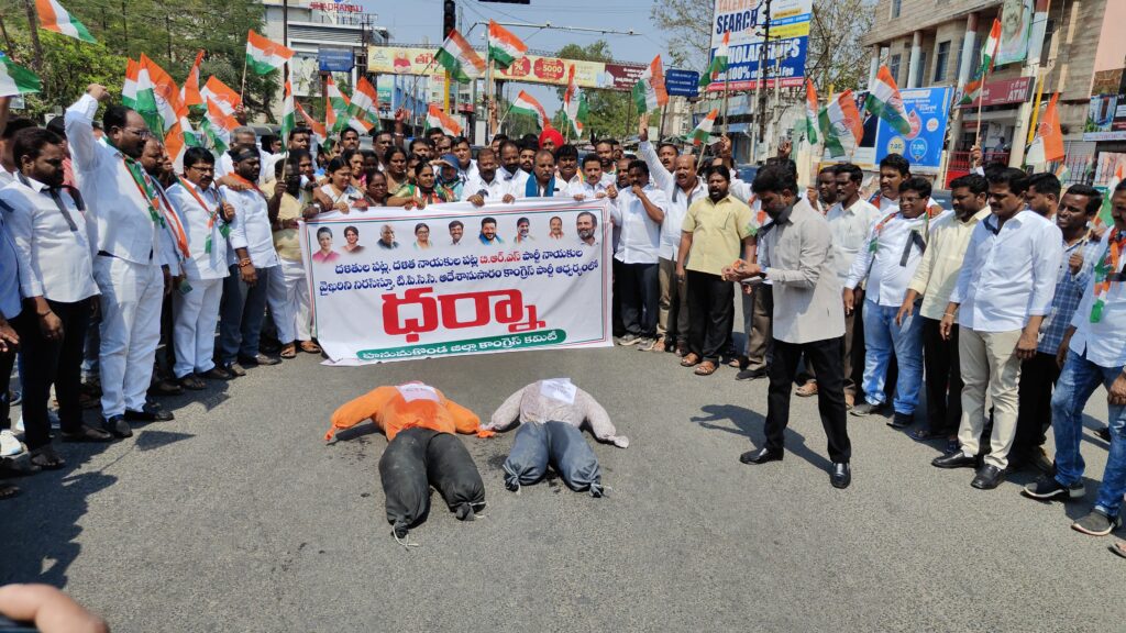 విధాత, హనుమకొండ : అసెంబ్లీలో స్పీకర్, దళిత ప్రజా ప్రతినిధుల పట్ల చులకన భావంతో మాట్లాడిన మాటలు బి ఆర్ ఎస్ ఎమ్మెల్యే జగదీష్ రెడ్డి అహంకారానికి నిదదర్శనమని వరంగల్ పశ్చిమ నియోజకవర్గ ఎమ్మెల్యే నాయిని రాజేందర్ రెడ్డి విమర్శించారు. జగదీష్ రెడ్డిని సస్పెండ్ చేయడం సరైన నిర్ణయమని సమర్ధించారు. జగదీశ్ రెడ్డి వాఖ్యలను సమర్ధిస్తూ కేటిఆర్,హరీష్ రావులు దళితల పట్ల చిన్నచూపు చూస్తున్నారని మండిపడ్డారు. ఆదివారం టీపీసీసీ పిలుపు మేరకు హనుమకొండ జిల్లా కాంగ్రెస్ పార్టీ ఆధ్వర్యంలో చేపట్టిన ధర్నా కార్యక్రమంలో భాగంగా హనుమకొండ జిల్లా కాంగ్రెస్ పార్టీ అధ్యక్షులు,ఎమ్మెల్యే నాయిని ,KUDA చైర్మన్ ఇనగల వెంకట్రాం రెడ్డి పాల్గొన్నారు.పార్టీ కార్యాలయం నుంచి అశోక జంక్షన్ వరకు ర్యాలీగా వచ్చి కేటిఆర్,జగదీశ్ రెడ్డి దిష్టి బొమ్మలను దగ్ధం చేశారు.