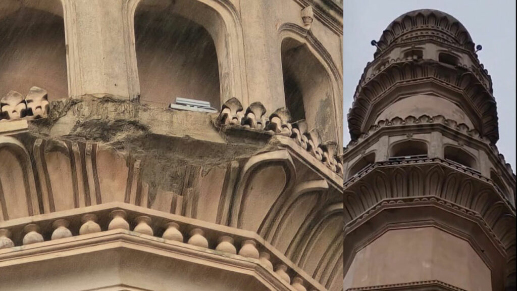విధాత : హైదరాబాద్ లో గురువారం కురిసిన భారీ వర్షానికి చారిత్రాక ఐకానిక్ కట్టడం చార్మినార్ పెచ్చులూడింది. ఈ ఘటన సోషల్ మీడియాలో వైరల్ గా మారింది. వర్షం ప్రభావంతో చార్మినార్లోని ఒక మీనార్ కు సంబంధించిన డిజైన్ నిర్మాణాల పెచ్చులు కూలి పడిపోయాయి.