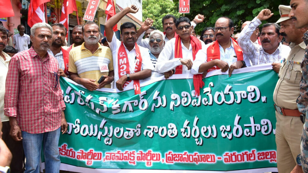 Operation Kagar | కేంద్రంలోని మోదీ, అమిత్ షా ప్రభుత్వం మధ్యభారతంలో మావోయిస్టుల అణచివేత పేరున వందల మంది మావోయిస్టులు, ఆదివాసులను చంపి వేస్తున్నదని వామపక్షాల నాయకులు ఆవేదన వ్యక్తంచేశారు. రాజ్యాంగ ప్రకారం నడవాల్సిన బీజేపీ ప్రభుత్వం రాజ్యాంగ వ్యతిరేక శక్తిగా పనిచేస్తున్నదని వారు విమర్శించారు. మావోయిస్టులతో శాంతి చర్చలు జరపాలని కేంద్ర ప్రభుత్వాన్ని డిమాండ్ చేస్తూ వామపక్షాల రాష్ట్ర కమిటీలు ఇచ్చిన పిలుపు మేరకు శనివారం వరంగల్లో సభ నిర్వహించారు. సీపీఐ (ఎంఎల్ ) న్యూడెమోక్రసీ గ్రేటర్ వరంగల్ కమిటీ కార్యదర్శి రాచర్ల బాలరాజు అధ్యక్షతన జరిగిన సభలో నాయకులు మాట్లాడుతూ ప్రజాస్వామ్యం పట్ల మోదీకి గౌరవం లేదని విమర్శించారు. బడా కార్పొరేట్ శక్తులైన అంబానీ, అదానీలకు అనుకూలంగా పరిపాలన సాగిస్తున్నదని ధ్వజమెత్తారు. మావోయిస్టులు శాంతి చర్చలకు సిద్ధమని ప్రకటించినా మోదీ ప్రభుత్వం హత్యాకాండను ఆపడం లేదని ఆగ్రహం వ్యక్తం చేశారు. ఆదివాసీలు, మావోయిస్టులు ఈ దేశ పౌరులు కాదా? అని ప్రశ్నించారు? గతంలో దేశంలో వివిధ ప్రాంతాల్లో పనిచేసిన ఉద్యమ సంస్థలతో చర్చలు జరిపిన సందర్భాలు ఉన్నాయని, ఇప్పుడు మాత్రం మోదీ ప్రభుత్వం చర్చలకు తావు లేకుండా నిరంకుశ విధానాలను అమలు చేస్తున్నదని విమర్శించారు. మావోయిస్టులు, ఆదివాసుల హననాన్ని ఆపివేసి, చర్చలు జరపాలని, వెంటనే కాల్పుల విరమణ ప్రకటించాలని డిమాండ్ చేశారు. ఈ సభలో సీపీఐ జిల్లా కార్యదర్శి మేకల రవి, ఎంసీపీఐయూ జిల్లా కార్యదర్శి పెద్దారపు రమేశ్, న్యూ డెమోక్రసీ, సీపీఎం నాయకులు గంగుల దయాకర్, నున్న అప్పారావు వలదాసు దుర్గయ్య, లిబరేషన్ జిల్లా కార్యదర్శి యాదగిరి, సీపీఐ ఎంఎల్, పౌర హక్కుల సంఘం, భారత్ బచావో నాయకులు మోడెం మల్లేశం, రమేశ్ చందర్, ప్రవీణ్, తెలంగాణ ప్రజా ఫ్రంట్ జిల్లా అధ్యక్షుడు జనగాం కుమార స్వామి, రైతుకూలీ సంఘం నాయకులు జన్ను కుమారస్వామి మాట్లాడారు.