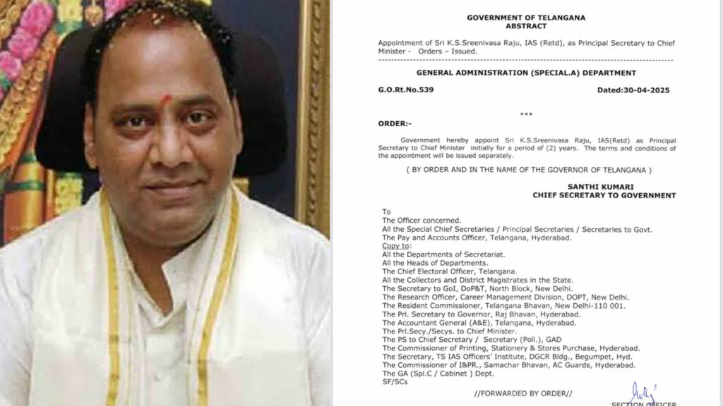 విధాత: సీఎం రేవంత్ రెడ్డి ప్రిన్సిపల్ సెక్రటరీగా రిటైర్డ్ ఐఏఎస్ కేఎస్. శ్రీనివాసరాజు నియామితులయ్యారు. ప్రస్తుతం తెలంగాణ ప్రభుత్వ సలహాదారుగా ఉన్న ఆయన మౌలిక వసతులు, ప్రాజెక్టుల సలహాదారుగా విధులు నిర్వహిస్తున్నారు. గత ఏడాది జూలై 1న ఆయన ఆ పదవిలో నియమించబడ్డారు. ప్రస్తుతం ముఖ్యమంత్రికి ప్రిన్సిపల్ సెక్రటరీగా పనిచేస్తున్న సీనియర్ ఐఎఫ్ఎస్ అధికారి చంద్రశేఖర్ రెడ్డి రాష్ట్ర ప్రధాన సమాచార కమిషనర్గా నియమితులయ్యారు. ఆయన స్థానంలో శ్రీనివాసరాజు బాధ్యతలు నిర్వహించనున్నారు.