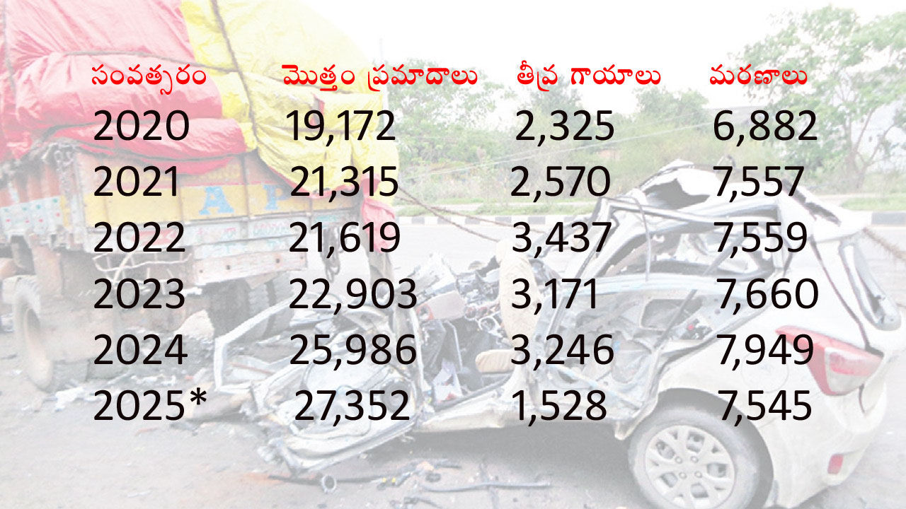తెలంగాణలో రోడ్లపై ప్రయాణించడం అంటే భయపడే పరిస్థితి ఎదురవుతున్నది. ఏ రోజు పేపర్ చూసినా, టీవీ చానళ్లు చూసినా రోడు ప్రమాద వార్త ప్రత్యేకించి గత రెండేళ్లుగా ప్రమాదాలు 20 శాతం పెరిగినట్టు గణాంకాలు సూచిస్తున్నాయి. వీటితోపాటు మరణాల సంఖ్య కూడా పెరుగుతుండటం ఆందోళన రేకెత్తిస్తున్నది. 2023లో మొత్తం సుమారు 22,900 ప్రమాదాలు చోటు చేసుకుంటే.. 2025లో వాటి సంఖ్య ఏకంగా సుమారు 27300కు చేరుకుందని పోలీసులు చెబుతున్నారు. ప్రత్యేకించి 2020 నుంచి ఈ పెరుగుదల కనిపిస్తున్నది. 2020లో 19,172 రోడ్డు ప్రమాదాలు చోటు చేసుకున్నాయి. వాటిలో 2,325 తీవ్రంగా గాయపడగా.. 6,882 మంది చనిపోయారు. 2025 నాటికి ప్రమాదాల సంఖ్య 27,352కి పెరగగా.. తీవ్రంగా గాయపడినవారి సంఖ్య 1,528గా ఉంటే.. 7,545 మంది చనిపోయారు.