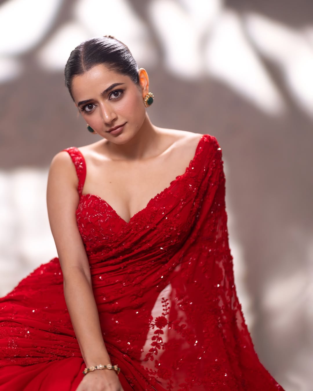 Ashika Ranganath stuns in a radiant red saree, carrying a regal aura with effortless confidence.