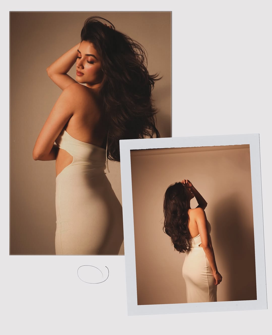 Bhagyashri Borse commands the frame in a seamless white dress, the body-hugging silhouette tracing her athletic symmetry and disciplined muscle tone.