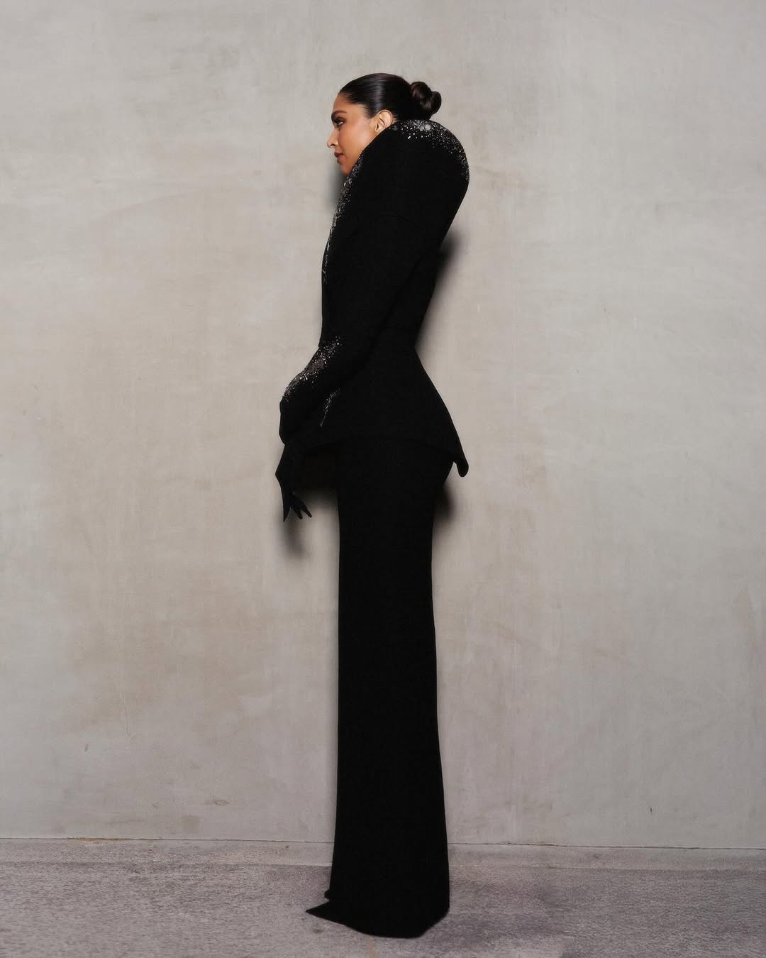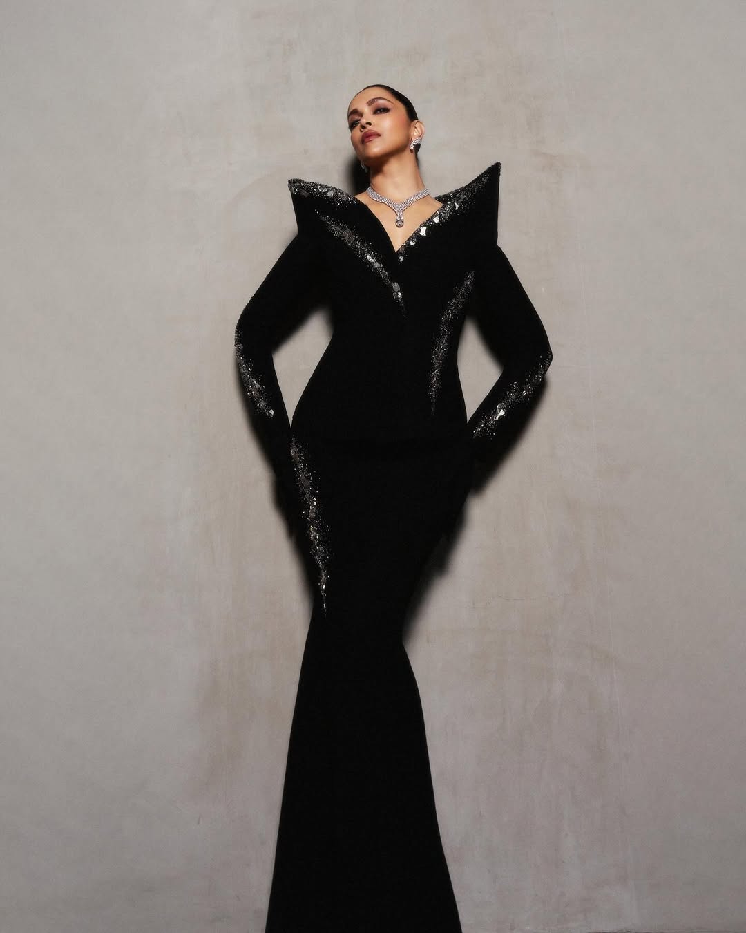 Draped in a striking black dress, Deepika Padukone turns minimalism into a statement. The sleek design, paired with her commanding presence, radiates modern glamour and undeniable star power.