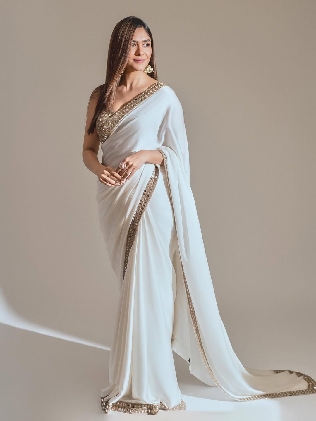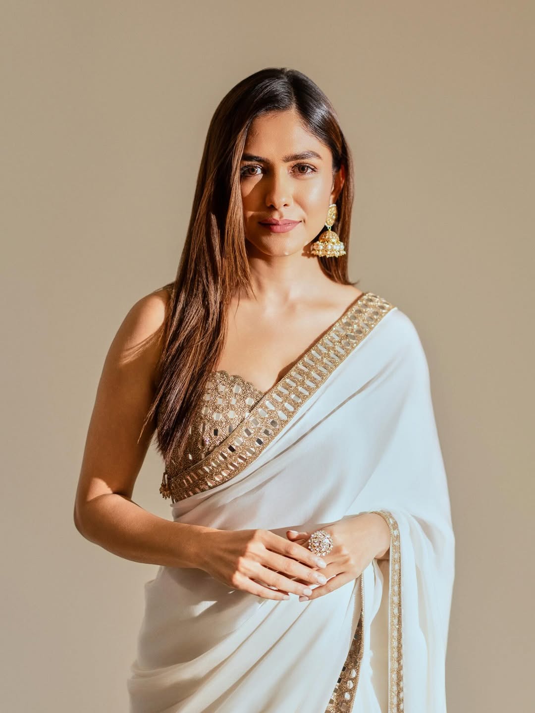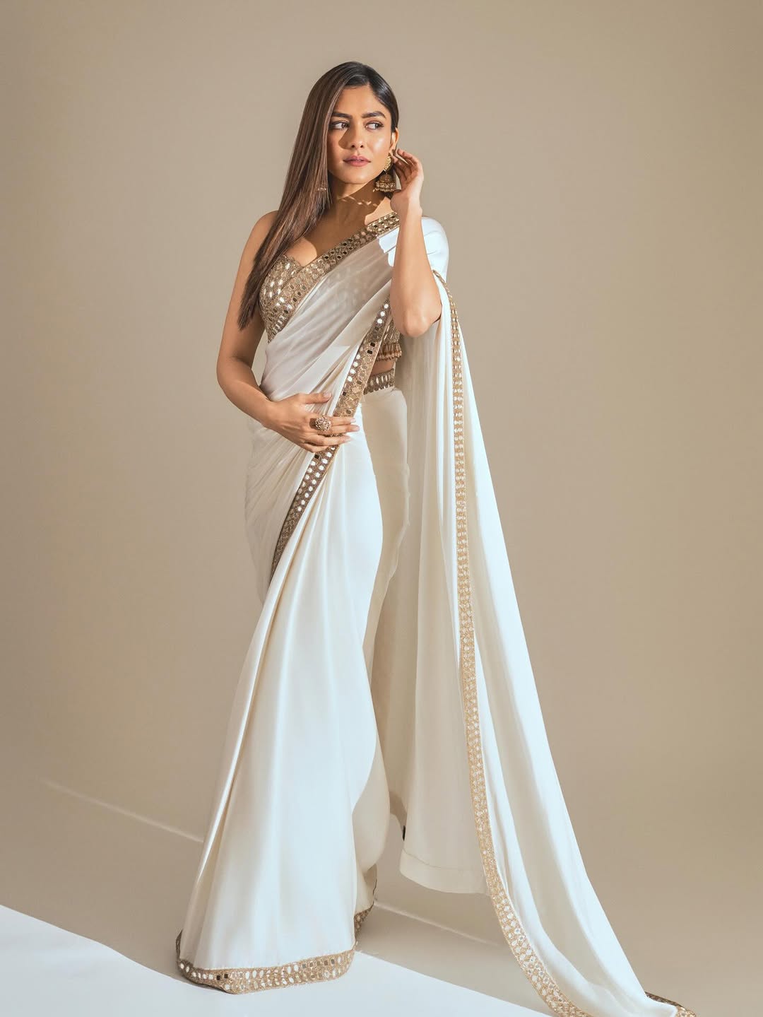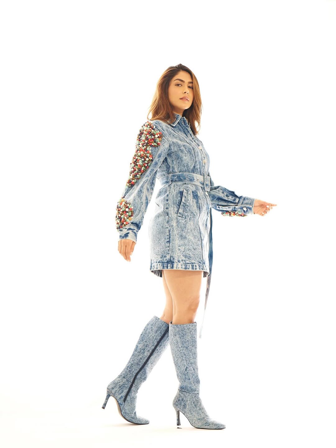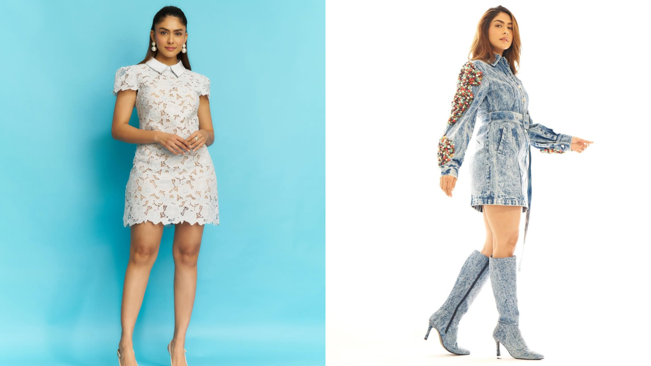 Mrunal Thakur looks effortlessly stunning in a white short skirt dress that perfectly blends elegance with modern charm. The crisp white hue enhances her natural glow, while the mini silhouette adds a playful yet sophisticated edge. The fitted design beautifully complements her frame, creating a chic and polished look.