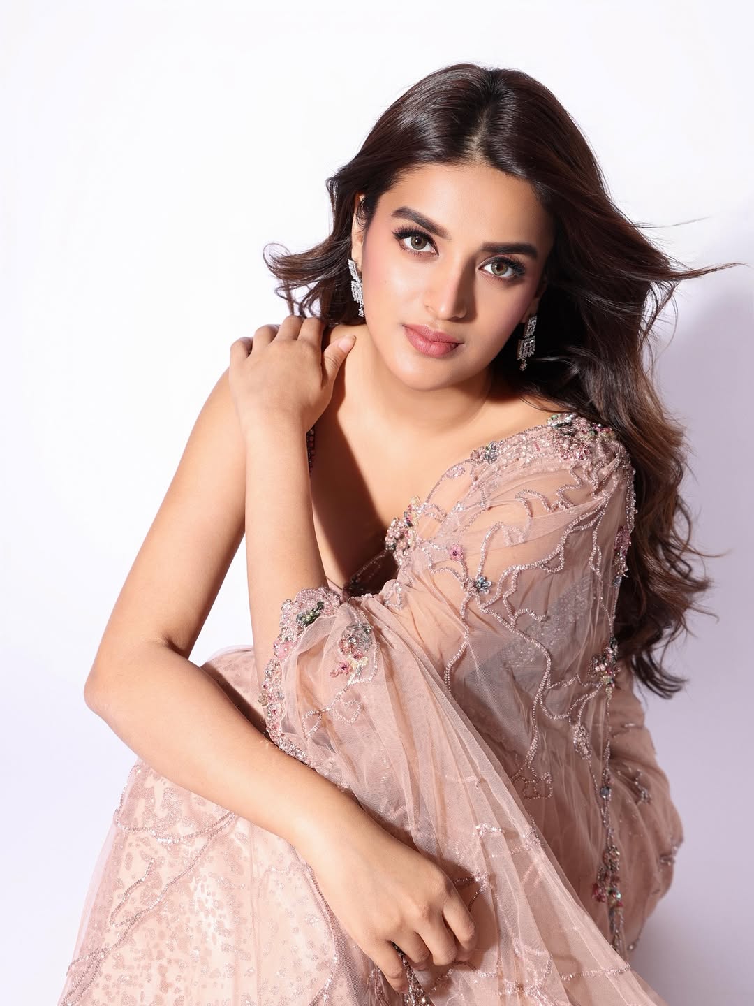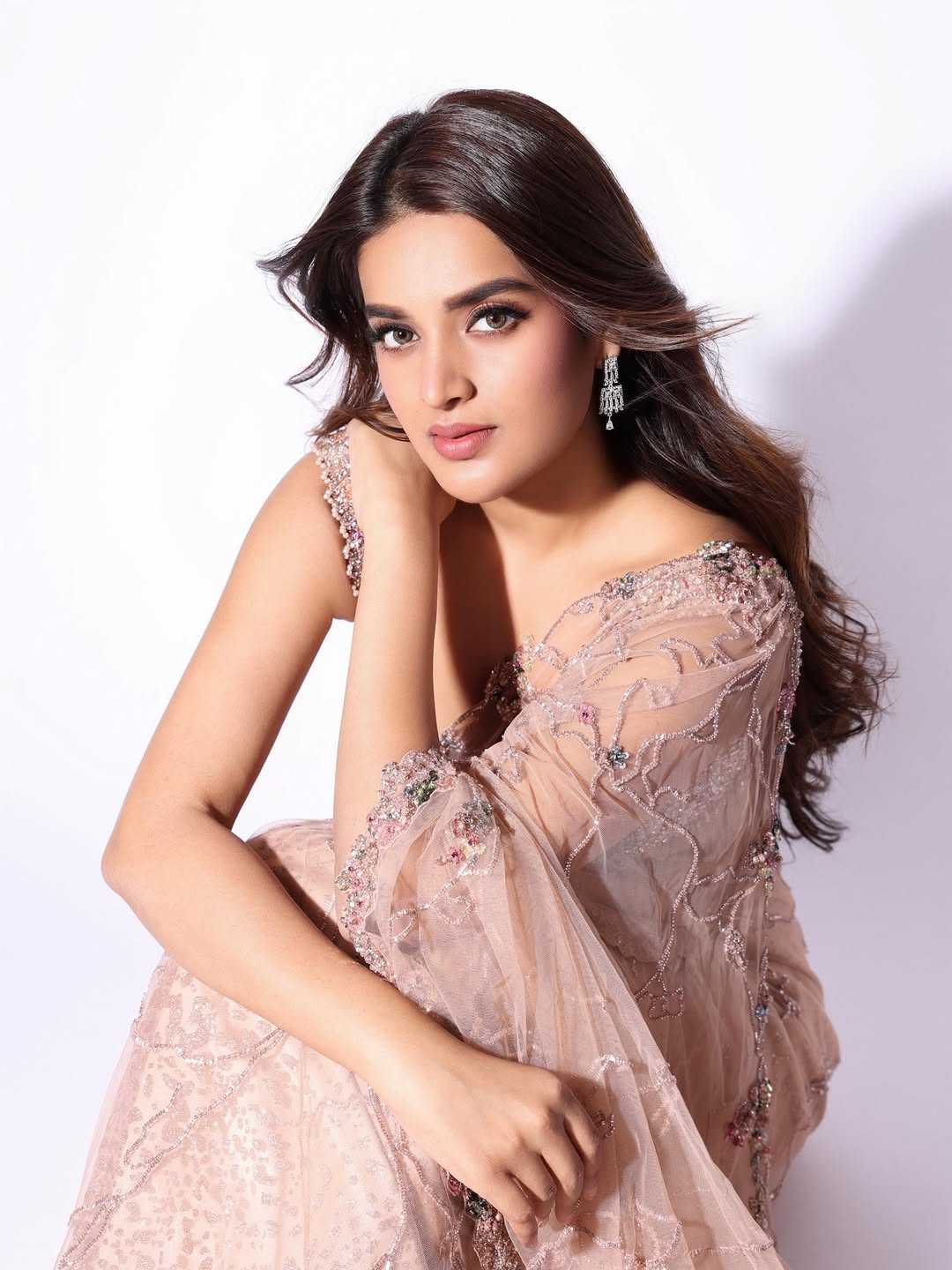 Draped in a stunning saree, Nidhhi Agerwal blends tradition with modern glam. The rich fabric and striking design enhance her radiant presence, while her confident poise and statement accessories elevate the entire look. She redefines ethnic fashion with her bold and captivating style.