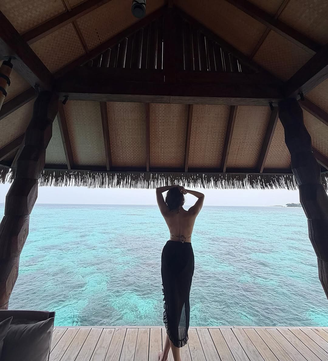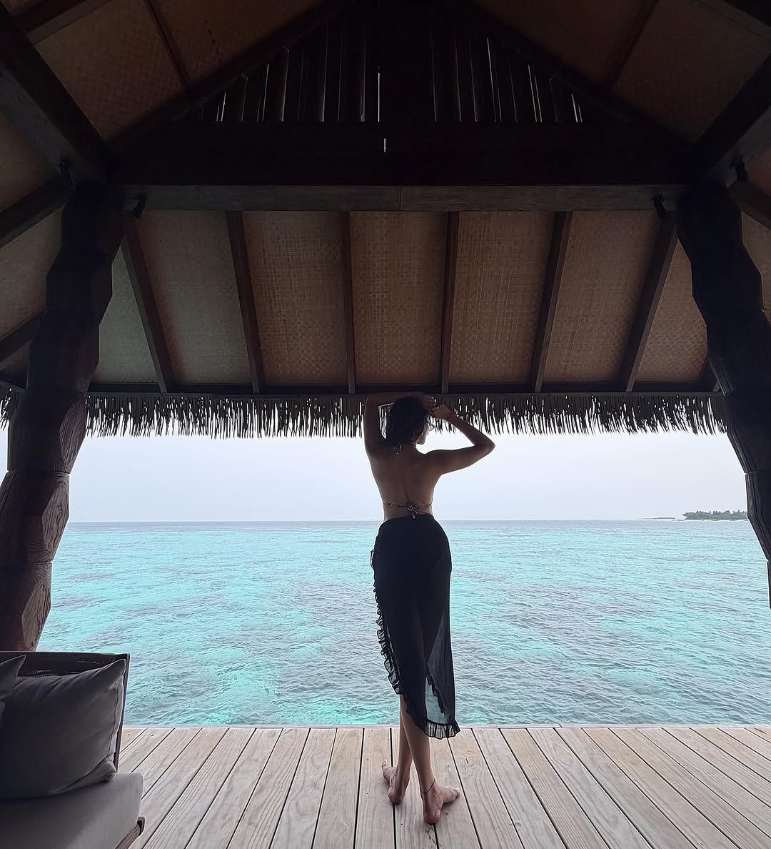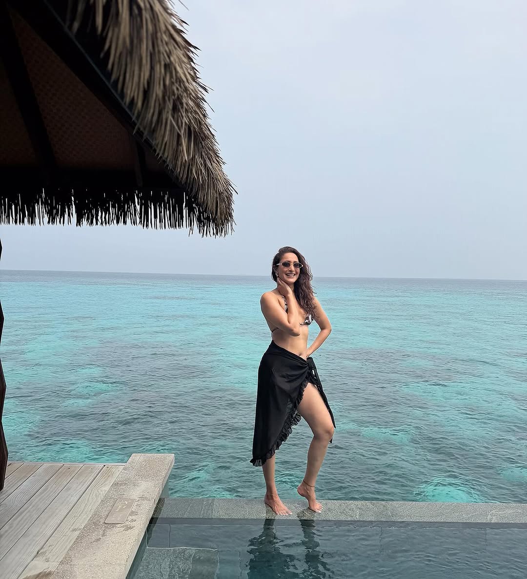 Pragya Jaiswal sizzles in a bikini against turquoise waters, flaunting her toned figure in relaxed, sun-drenched poses by the sea.