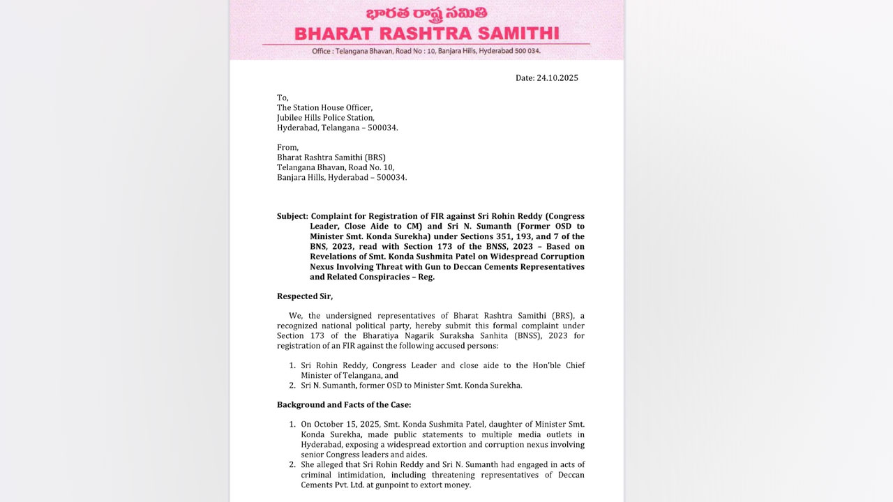 విధాత, హైదరాబాద్ : మంత్రి కొండా సురేఖ కుమార్తె ఆరోపణల ఆధారంగా డెక్కన్ సిమెంట్స్ యాజమాన్యాన్ని బెదిరించిన కాంగ్రెస్ నేత రోహిన్ రెడ్డి, మాజీ ఓఎస్డీ సుమంత్లపై క్రిమినల్ కేసు నమోదు చేయాలని బీఆర్ఎస్ నాయకులు పోలీసులకు ఫిర్యాదు చేశారు. జూబ్లీహిల్స్ పోలీస్ స్టేషన్లో ఈ మేరకు బీఆర్ఎస్ నేతలు ఫిర్యాదు అందించారు.