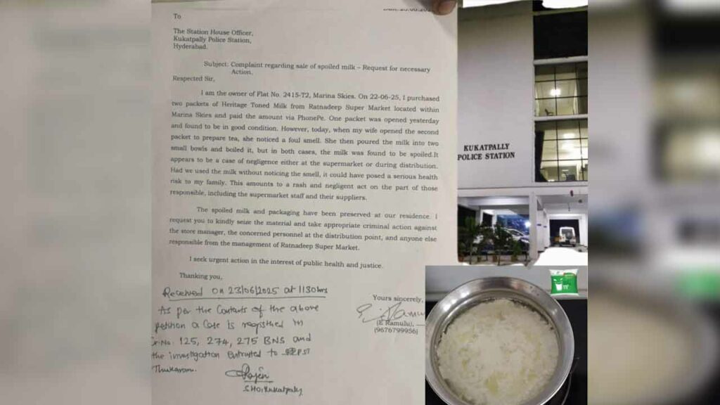 కూకట్పల్లిలోని మెరీనా స్కైస్ అపార్ట్మెంట్లో నివాసం ఉంటున్న ఈ. రాములు అనే వ్యక్తి.. రత్నదీప్ సూపర్ మార్కెట్లో హెరిటేజ్ టోన్డ్ మిల్క్ ప్యాకెట్లు రెండింటిని ఈ నెల 22న కొనుగోలు చేశాడు. ఇంటికి వెళ్లాక అదే రోజు ఒక ప్యాకెట్ను ఉపయోగించారు. ఇక మరుసటి రోజు అంటే 23వ తేదీన మరో ప్యాకెట్ను ఓపెన్ చేసి.. మరిగించగా అవి పగిలిపోయాయి. దుర్వాసన కూడా వచ్చింది. దీంతో రత్నదీప్ సూపర్ మార్కెట్కు వెళ్లి ప్రశ్నించగా, దానికి మేం ఏం చేస్తామని స్టోర్ మేనేజర్ దురుసుగా సమాధానం ఇచ్చాడు.