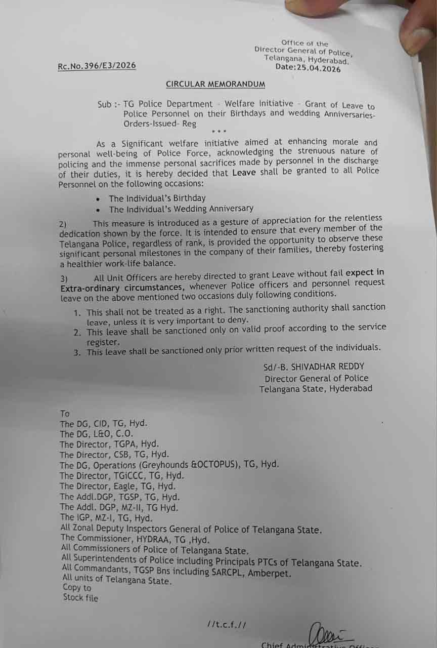 ఇలా 24 గంటల పాటు విధుల్లో ఉండే పోలీసులకు కాంగ్రెస్ ప్రభుత్వం గుడ్ న్యూస్ చెప్పింది. ప్రతి పోలీసు తమ పుట్టిన రోజు నాడు, పెళ్లి రోజు నాడు సెలవు తీసుకోవచ్చు అని డీజీపీ శివధర్ రెడ్డి స్పష్టం చేశారు. ఈ మేరకు డీజీపీ శివధర్ రెడ్డి అధికారిక ఉత్తర్వులు జారీ చేశారు.