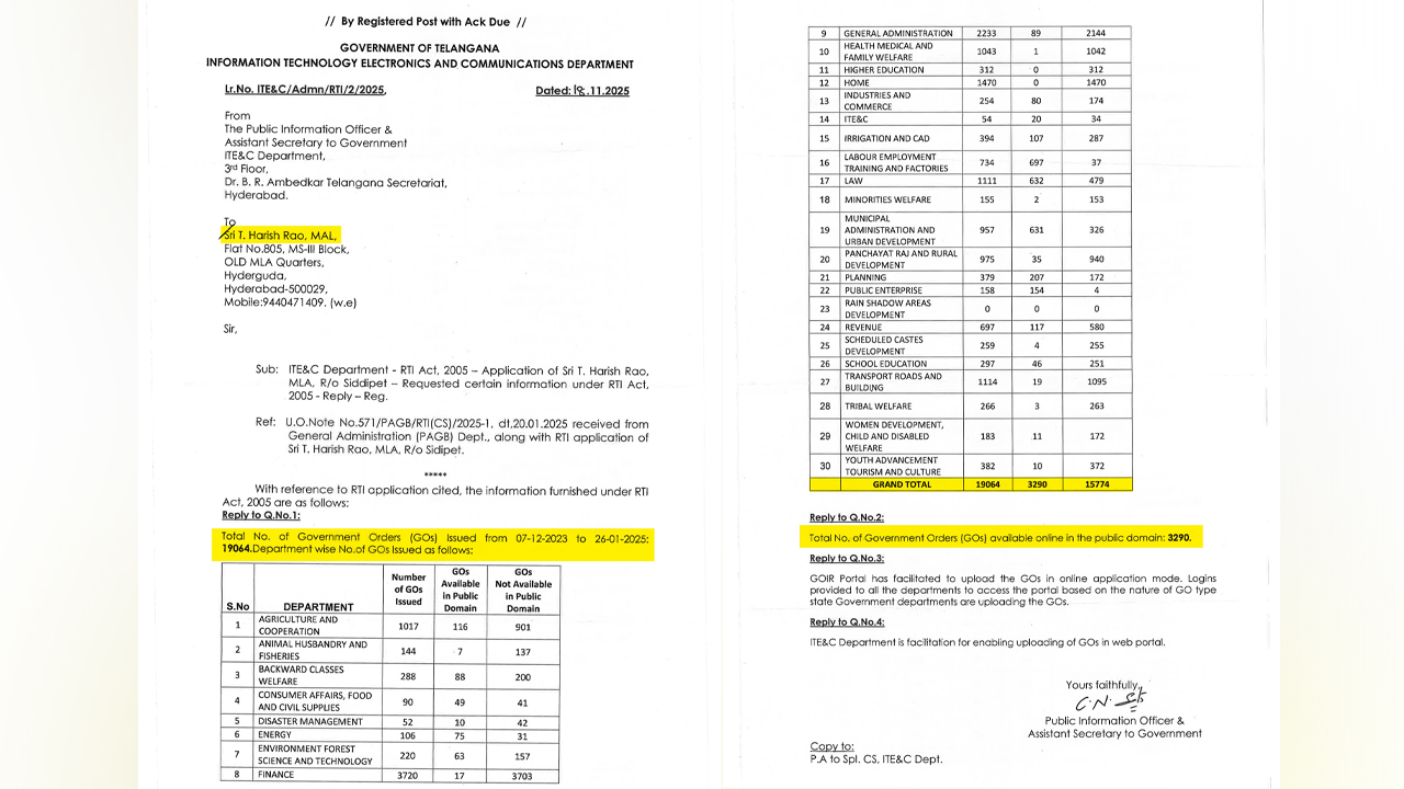 ప్రజాపాలన అని చెప్పి అధికారంలోకి వచ్చిన కాంగ్రెస్.. జీవోలు దాచుతూ చేస్తున్న డ్రామా..RTI సమాధానం ఆధారంగా మా పార్టీ సీనియర్ నాయకులు ఎర్రోళ్ల శ్రీనివాస్ హైకోర్టులో వేసిన పబ్లిక్ ఇంట్రెస్ట్ లిటిగేషన్ (PIL) తో బట్టబయలు కాబోతున్నదని హరీష్ రావు పేర్కొన్నారు. 07-12-2023 నుంచి 26-01-2025 వరకు అంటే మొత్తం 13 నెలల్లో 19,064 జీవోలు జారీ చేయగా, వాటిలో కేవలం 3,290 జీవోలు మాత్రమే పబ్లిక్ డొమైన్లో ఉంచడంలో అంతర్యం ఏమిటి? అని నిలదీశారు. ఒక్క ఏడాదిలో 15,774 జీవోలు అంటే 82 శాతం జీవోలను దాచి పెట్టి ప్రభుత్వం ఏం చేస్తున్నట్లు? అని ప్రశ్నించారు. ఇదేనా మీరు చెప్పిన ప్రజా ప్రభుత్వం? అని సీఎం రేవంత్ రెడ్డిపై హరీష్ రావు మండిపడ్డారు.