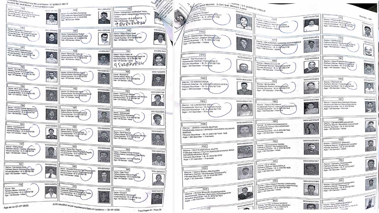 దొంగ ఓట్లతో ఉప ఎన్నికలో గెలవాలని కాంగ్రెస్( Congress)అభ్యర్థి నవీన్ యాదవ్(Naveen Yadav) ఒకటే ఇంట్లో 43 ఓట్లు నమోదు చేయించాడని ఆరోపించారు. ఇటీవల నవీన్ యాదవ్ ఓటర్ కార్డులు పంచారని..అవి నకిలీ ఓటరు(fake voters) కార్డులు కావచ్చని ఆరోపించారు. కాంగ్రెస్ పార్టీ ..ఓవైపు రాహుల్ గాంధీ దేశవ్యాప్తంగా ఓటు చోరీ అంటూ గగ్గోలు పెడుతుంటే..మరోవైపు తెలంగాణలో ఆ పార్టీ నాయకులు ఓటు చోరికి పాల్పడుతున్నారని కౌశిక్ రెడ్డి విమర్శించారు. జూబ్లీహిల్స్ ఉప ఎన్నికలో అడ్డదారిలో గెలిచేందుకు కాంగ్రెస్ నాయకులు ఎన్ని అక్రమాలకు పాల్పడినప్పటికి..ప్రజలు మాత్రం బీఆర్ఎస్ అభ్యర్థి మాగంటి గోపినాధ్ సతీమణి సునితను గెలిపించేందుకు సిద్దంగా ఉన్నారన్నారు. 8- 3- 231/B/160, 8-3-231/B/118, 8-3-231/B/119, 8-3-231/B/164 మొదలైన ఇళ్లల్లో..కేవలం ఇద్దరు, ముగ్గురు మాత్రమే ఉంటే వందల సంఖ్యలో ఓట్లు నమోదయ్యారని మాజీ కార్పొరేషన్ ఛైర్మన్ వాసుదేవ ఆరోపించారు.