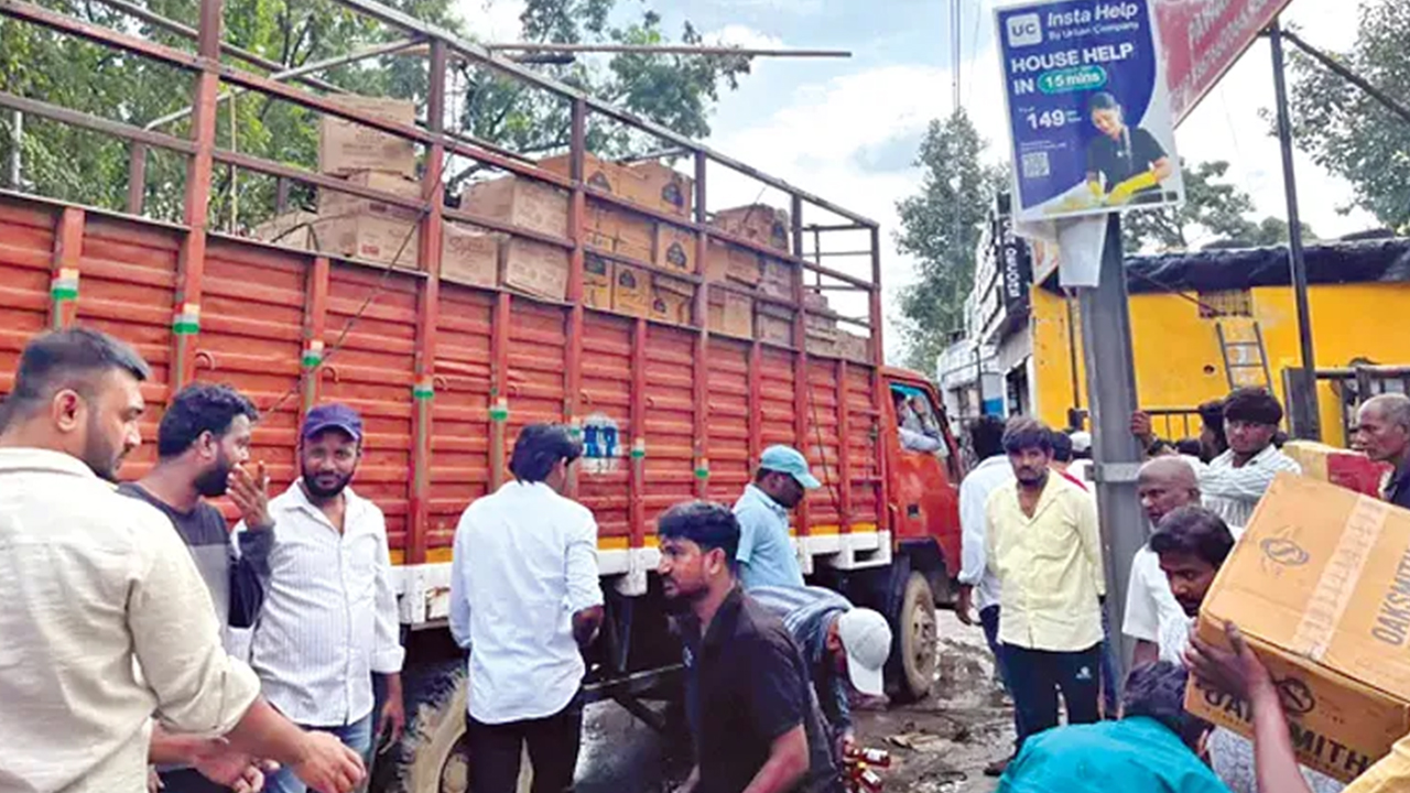 విధాత, హైదరాబాద్ : సాధారణంగా ట్రాన్స్ పోర్టు లారీలు రోడ్డు ప్రమాదాలకు గురైన సందర్భాల్లో వాటిలో రవాణా అవుతున్న సరుకులు రోడ్డుపైన పడిపోగానే వాటి కోసం జనం ఎగబడటం చూస్తుంటాం. ఎక్కువగా ఆహార పదార్దాలు..కూల్ డ్రింక్స్, చమురు ట్యాంకర్లు బోల్తాపడిన సందర్బాల్లో ఈ తరహా దృశ్యాలు చోటుచేసుకోవడం కనిపిస్తుంటుంది. ఈ సారి మద్యం లోడ్ లారీకి ఆ పరిస్థితి ఎదురైంది.