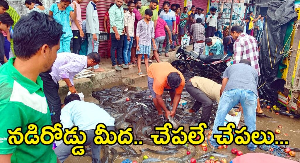 మహబూబాబాద్ (Mahabubabad)జిల్లా మరిపెడ (Maripeda) వాసులకు ఉన్నట్లుండి అదృష్టం ఎగురుకుంటూ వచ్చింది. వరంగల్(Warangal) నుండి ఖమ్మం(Khammam)కు బతికున్న కొర్రమీను చేప(Korameenu fish)లతో వెళుతున్న డిసిఎం మరిపెడ ఊళ్లో నడిరోడ్డు మీద అడ్డంగా (Overturned)పడిపోయింది. దాంతో అందులో ఉన్న చేపలన్నీ చెల్లాచెదురుగా రోడ్డు మీద పడిపోయాయి. అవన్నీ ఖరీదైన కొర్రమీను చేపలు. పైగా ప్రాణంతో ఉన్నాయి. ఇంకేం… జనాలు తండోపతండాలుగా వాటిపై దాడి చేసారు. ఎవరికి దొరికినవి వారు పట్టుకుపోయారు. దీంతో వరంగల్–ఖమ్మం హైవే మీద మరిపెడ వద్ద విపరీతమైన ట్రాఫిక్ జామ్ (Traffic Chaos) ఏర్పడింది. రెండు వైపులా వందలాది వాహనాలు నిలిచిపోయాయి.
