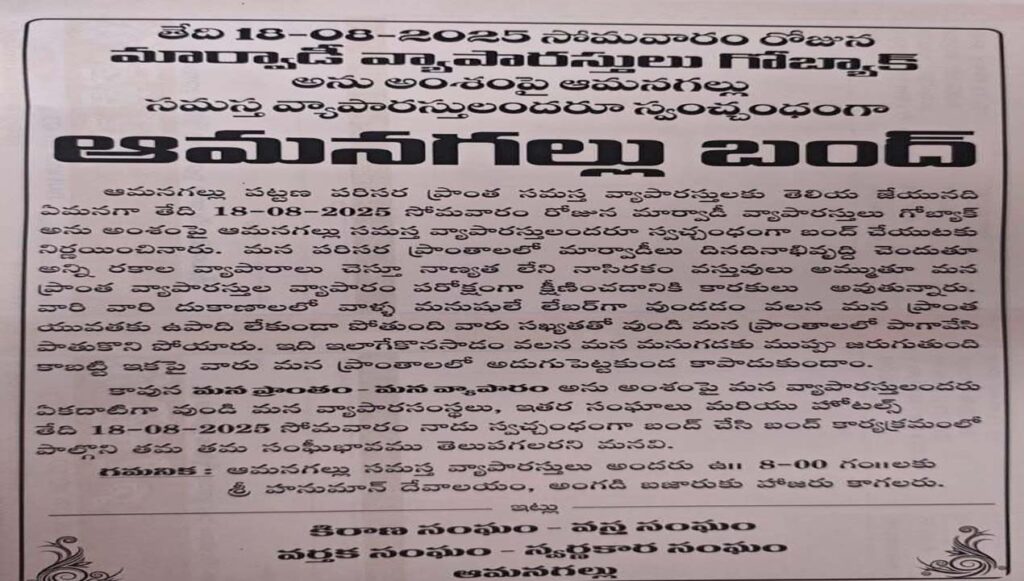 విధాత : తెలంగాణలో ఇటీవల చెలరేగిన మార్వాడీ వ్యతిరేక ఉద్యమం వివాదస్పదమవుతోంది. తెలంగాణ అస్తిత్వ..ఆత్మగౌరవం పేరుతో మార్వాడీ వ్యతిరేక ఉద్యమం సాగిస్తున్న తీరు ఆందోళనకరంగా మారింది. మార్వాడీ వ్యతిరేక ఉద్యమంలో భాగంగా రంగారెడ్డి జిల్లా ఆమనగల్లు లో ఈ నెల 18న మార్వాడీ వ్యాపారస్తుల గో బ్యాక్ అంటూ పట్టణ బంద్ తలపెట్టడం చర్చనీయాంశమైంది. మన ప్రాంతం-మన వ్యాపారం నినాదంతో మన వ్యాపార సంస్థలు, సంఘాలు, హోటల్స్ అంతా కూడా సోమవారం నిర్వహించే బంద్ ను విజయవంతం చేయాలని ఆమన గల్లు కిరాణ, వస్త్ర, వర్తక, స్వర్ణకార సంఘాల పేరుతో బంద్ కు పిలుపునిచ్చారు. ఏకంగా కరపత్రం సైతం విడుదల చేశారు.