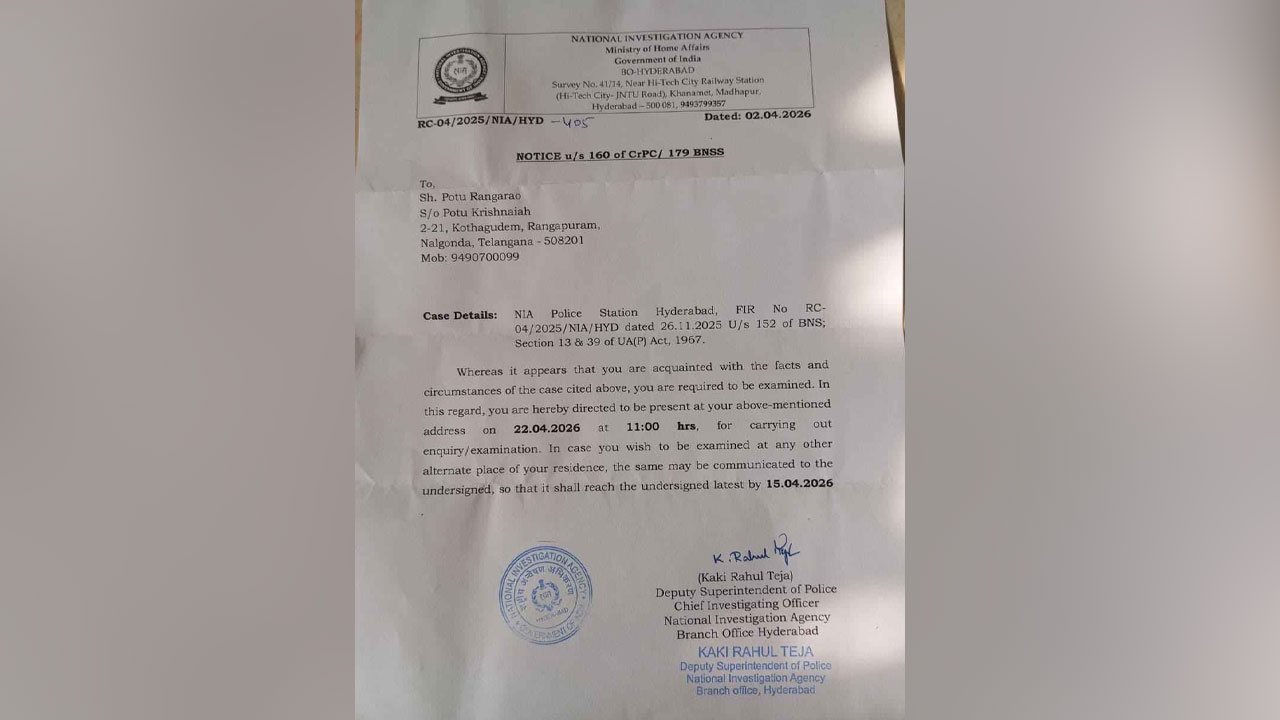 విధాత, ప్రత్యేక ప్రతినిధి: సీపీఐ (ఎంఎల్) మాస్ లైన్ (ప్రజాపంథా) రాష్ట్ర కార్యదర్శి పోటు రంగారావుకు జాతీయ దర్యాప్తు సంస్థ (NIA) నోటీసు జారీ చేసింది. పోటు రంగారావుపై దేశద్రోహం, ఉపా కేసు ఉందని, ఈనెల 22వ తేదీన ఉదయం 11 గంటలకు విచారణకు హాజరు కావాలని నోటీసులో NIA పేర్కొంది. CRPCలోని 160 సెక్షన్ కింద నోటీస్ జారీ చేశారు. గత నవంబర్ 26వ తేదీన హైదరాబాద్ ఎన్ఐఏ పోలీస్ స్టేషన్ లో నమోదైన ఎఫ్ఐఆర్ ప్రకారం.. బీఎన్ఎస్ చట్టంలోని సెక్షన్ 152, UA(P) యాక్ట్ లోని సెక్షన్ 13, 39 కింద కేసు నమోదైనట్లు నోటీసులో పేర్కొన్నారు. ఈ నోటీసు ఈ నెల 2వ తేదీన జారీ చేసినట్లు అందులో పేర్కొన్నారు. దశాబ్దాలుగా ఖమ్మంలోనే నివాసముంటున్న పోటు రంగారావుకు ఆయన ఆధార్ కార్డు చిరునామా ఆధారంగా హుజూర్ నగర్ మండలం రంగాపురంలోని నివాసానికి రావడం గమనార్హం. ఇది ప్రశ్నించేవారిపై ఉక్కుపాదం మోపాలనే ప్రభుత్వ యత్నమని పోటు రంగారావు ఈ సందర్భంగా వ్యాఖ్యానించినట్లు సమాచారం.