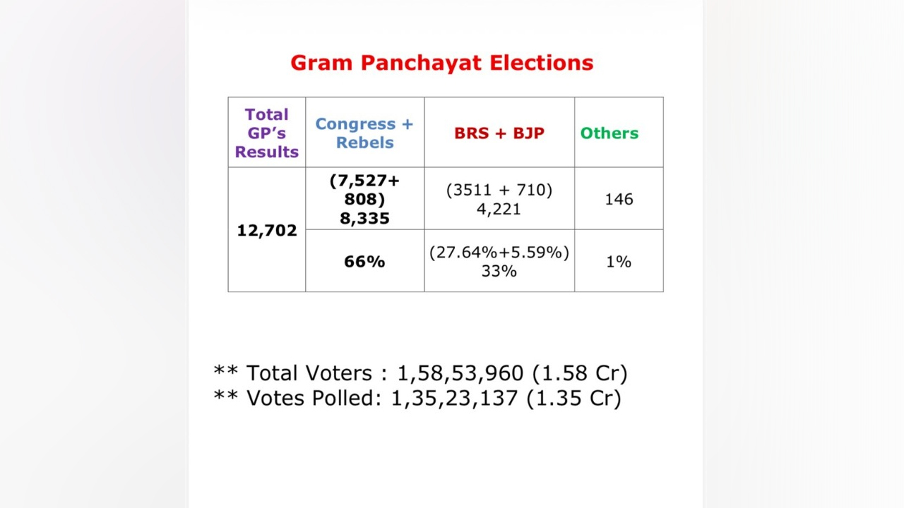 పంచాయతీ ఫలితాలు మా రెండేళ్ల పాలనకు ప్రజలిచ్చిన తీర్పు: సీఎం రేవంత్ రెడ్డి. 66% స్థానాలతో కాంగ్రెస్ జైత్రయాత్ర, గజ్వేల్లోనూ కేసీఆర్కు ప్రజలు చుక్కెదురు చూపారని సీఎం స్పష్టం చేశారు.