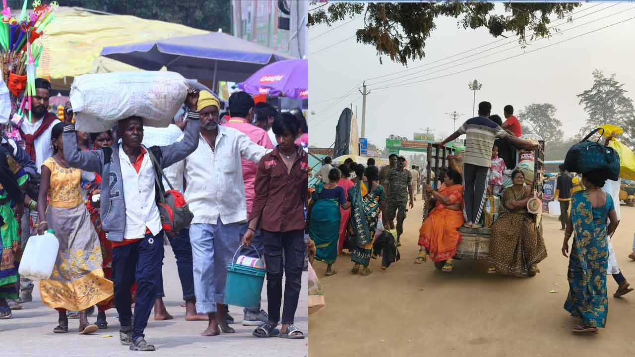 మేడారం సమ్మక్క సారలమ్మ జాతరకు దేశం నలుమూలల నుండి భక్తులు అధిక సంఖ్యలో పోటెత్తి వచ్చారు. నాలుగు రోజులుగా మేడారం పరిసర ప్రాంతాలు అమ్మవార్ల దర్శనానికి వచ్చిన భక్తులతో మేడారం పరిసర ప్రాంతాలు భక్తుల తో కిట కిట లాడాయి. మేడారం జాతర చివరి రోజు సమ్మక్క, సారలమ్మ అమ్మవార్లు వనప్రవేశం జరుగుతున్న నేపథ్యంలో అమ్మవార్లను దర్శించుకునీ భక్తులు తిరిగి వారి వారి స్వగ్రామాలకు తరలి వెళ్తున్నారు. భక్తుల తిరుగు ప్రయాణం సందర్భంగా ఆర్.టి.సి బస్టాండ్ ప్రాంతం లోని క్యూ లైన్లు నిండిపోయాయి.ఇప్పటి వరకు దాదాపు 12వేల ట్రిప్పుల బస్సులు నదిచినట్లు అధికారులు తెలిపారు.భక్తుల సౌకర్యార్థం ఏర్పాటు చేసిన గుడారాలు, టెంట్లు ఖాళీగా దర్శనమిస్తున్నాయి. భక్తులు తమ సామగ్రినీ, పిల్లలను చేతిలో పట్టుకొని తిరుగు ప్రయాణం సాగిస్తున్నారు.